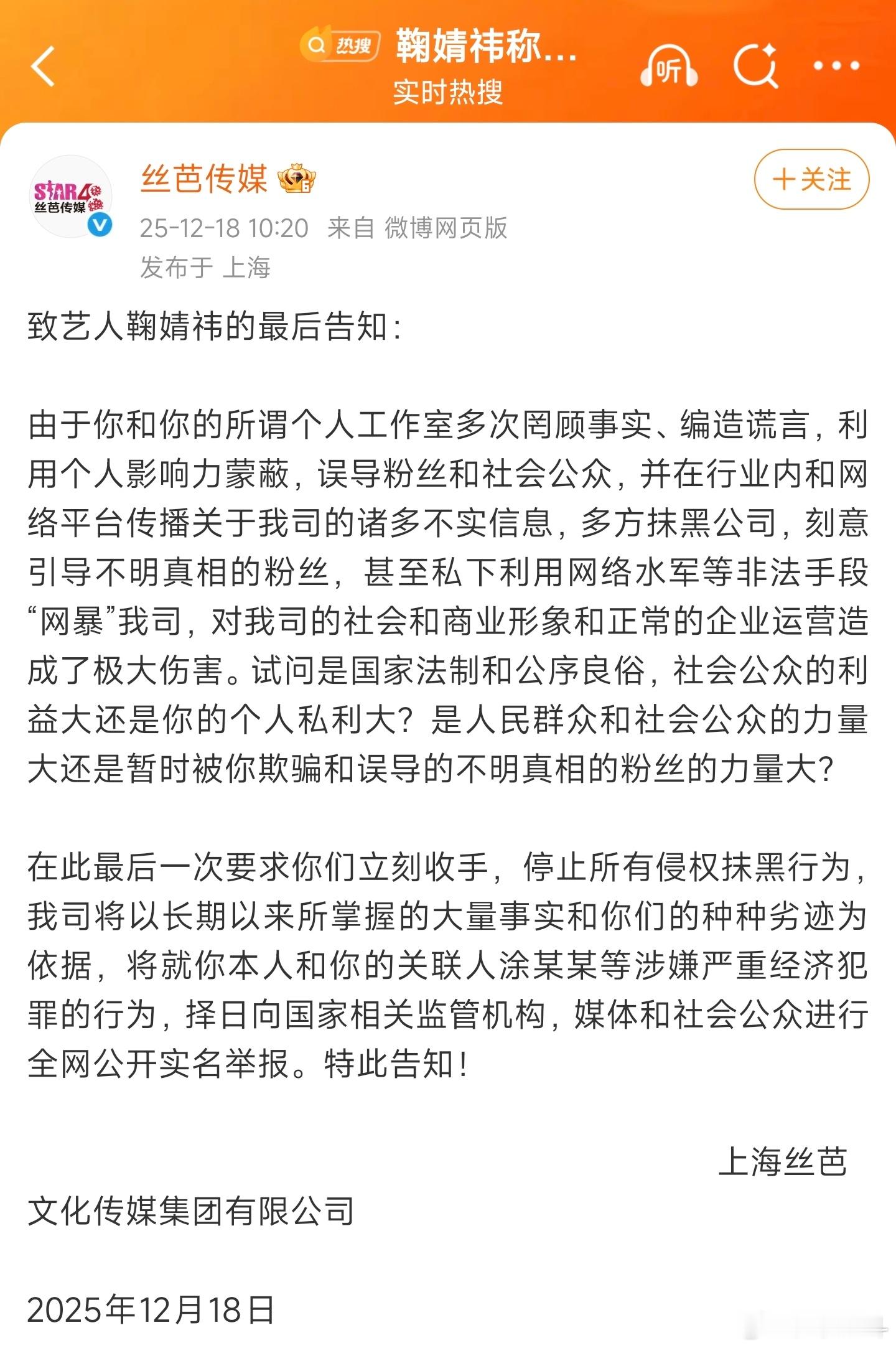 感觉这是要同归于尽啊?丝芭指控鞠婧祎严重经济犯罪丝芭致鞠婧祎最后告知