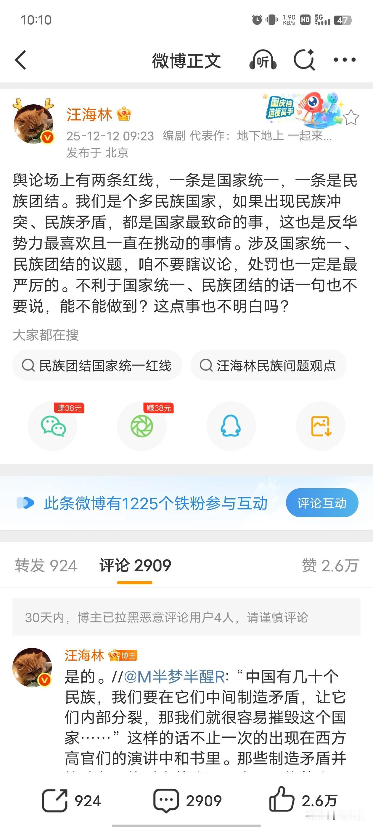 这两条红线千万别踩!汪海林把话说透了!汪海林这次直接把话撂这儿了:国家统一和民族团结,就是咱们舆论场上两条绝对不能碰的高压线!这可不是开玩笑的,谁碰谁倒霉。 咱们国家这么大,民族这么多,最怕的就是有人在这上面挑事儿。 那些不怀好意的势力,整天就盯着这些地方找缝下蛆呢。 所以涉及这些话题,咱们普通人千万别瞎掺和,别乱议论,更别跟着瞎起哄——这不是你该操心的事儿! 说句大白话:不利于团结的话,一句都别说;拿不准的消息,一次都别传。 网上说话也得带脑子,别等出了事才后悔。管住嘴,不惹事,这点道理还不明白吗?