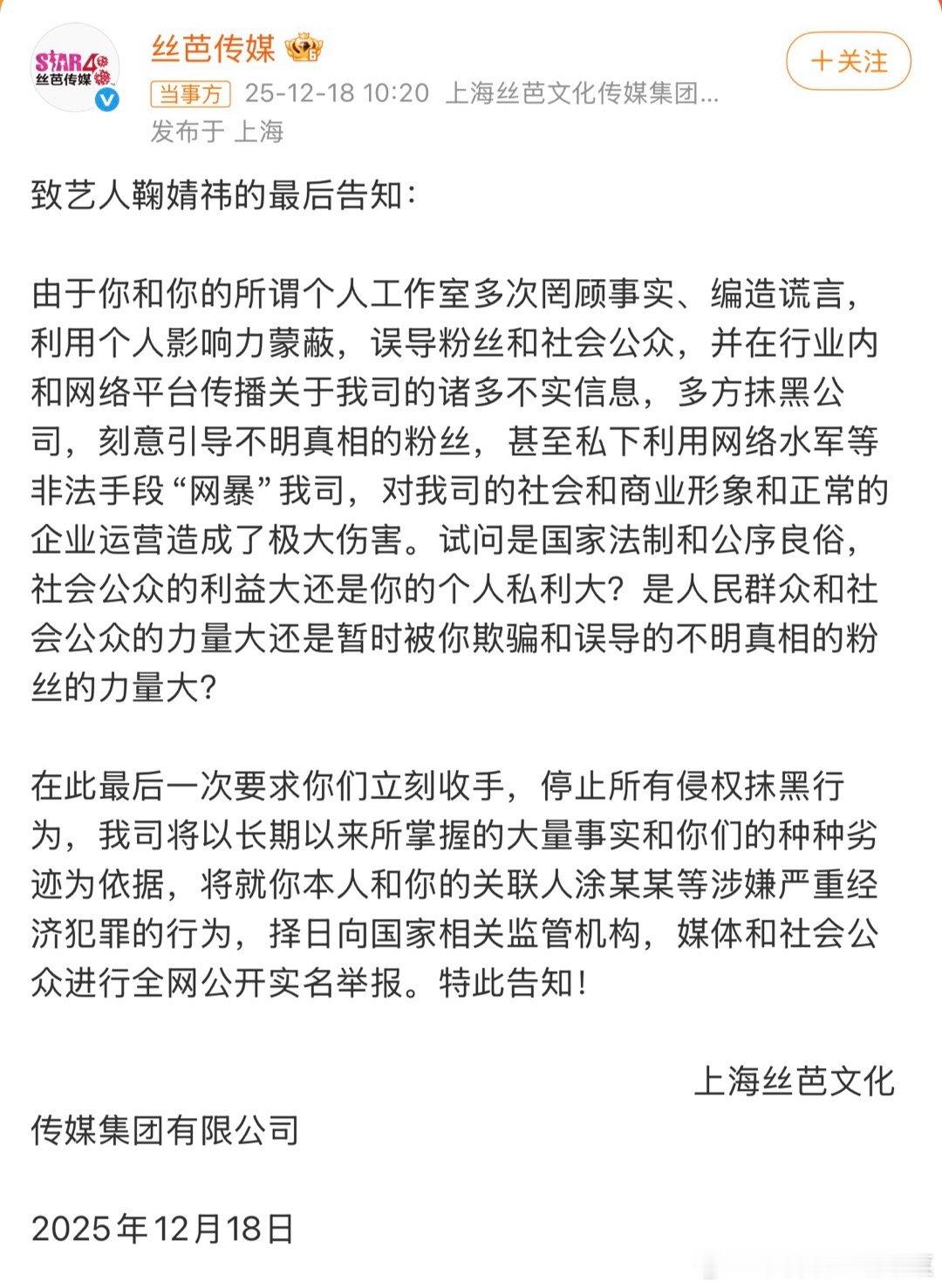 好可怕丝芭喊话鞠婧祎再不收手将实名举报