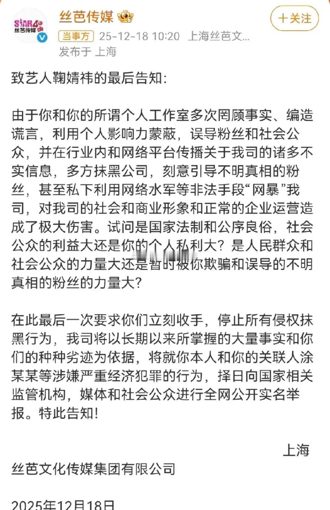 12月18号,丝芭发了个文,实名举报鞠婧祎涉嫌经济犯罪。这声明一出来,明眼人都看得出来,丝芭和鞠婧祎之间,肯定得有一方栽进去。为啥这么说呢?要是丝芭举报的是真的,鞠婧祎真跟经济犯罪沾边了,那她轻了可能被拘留,重了就得蹲大牢,少则几个月,多则几十年都有可能。可要是丝芭是瞎编的,故意诬陷鞠婧祎,那鞠婧祎也能反过来告丝芭。你想啊,丝芭这么公开地诬陷人搞经济犯罪,这可比一般的造谣严重多了,这本身也是犯罪,搞不好自己也得进去。所以啊,两边闹到这份上,根本没和解的余地了,肯定得有一方进去。就是不知道最后到底谁能赢呗。