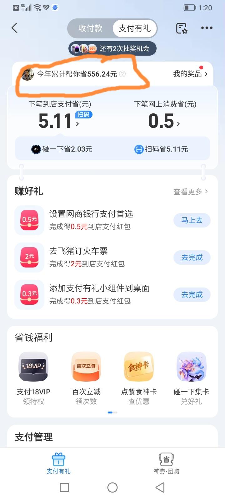 看了一下支付宝,今年省钱省了556块,这种省钱不是要凑满多少减优恵那种,而是实实在在的在超市早餐店用出来的。大多都是今年8月份开始看支付宝视频红包领的,8,9两月份比较多,那时候大额红包15块的30块的。当时这两个月,每个月视频红包就有80到90块,然后红包后面还有小程序,每天可以领一块多。10月份就少了,就视频红包加小程序,可能也就80块钱,11月份可能只有50块钱。现在视频红包越来越少,有时候都不给你完成任务,一看这种我就不做了,现在每个月也就三十块钱样子,后面小程序也是每天现在只有两毛多一点。好在支付宝有时候会搞一些其他的小程序,所以今年到现在省了有五百多。还有两个月过年,我想再省个七八十块钱是没有问题的。还有一些小程序,钱是直接打到余额里的。今年差不多大概有个200来块钱是有的,总的加起来今年省800来块钱是有的,也算是快有一个月生活费了,还是很不错的。如果你也想看看自己支付宝今年省了多少钱,很简单,你在支付宝首页点击“收付款”,然后上面会有一栏“支付有礼”,你再点进去就可以看到了。支付宝 说说支付宝的事 支付宝年度账单 支付宝支付 支付宝收益 支付宝商家扣款 支付宝收款 支付宝收费