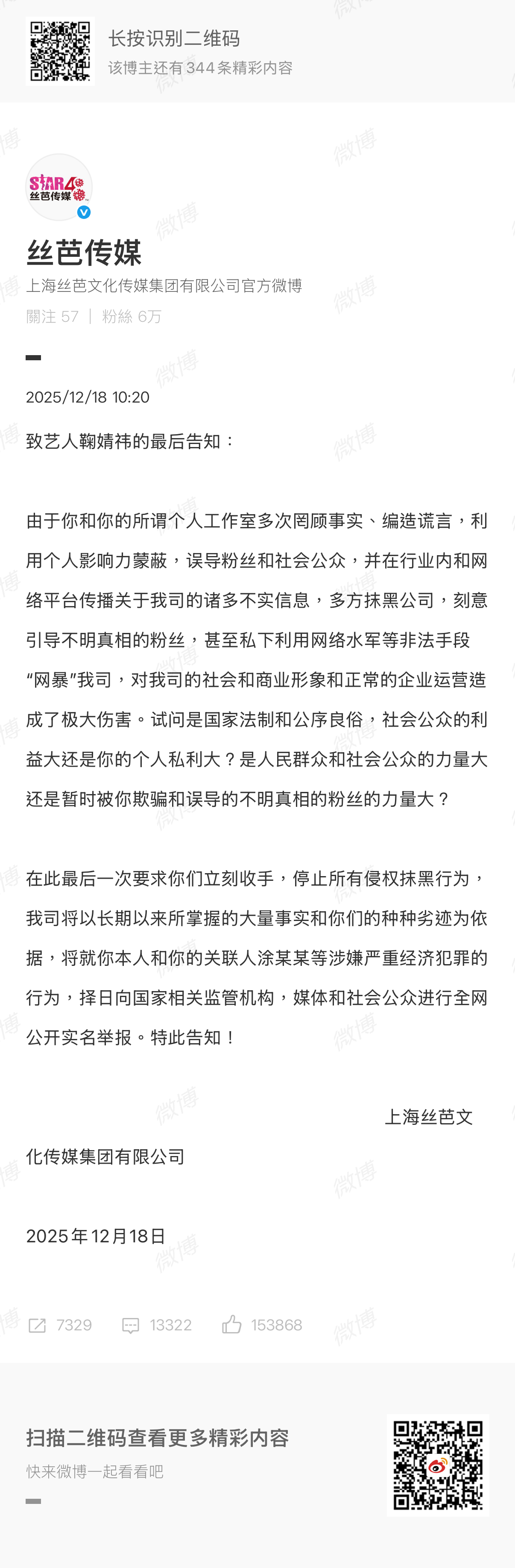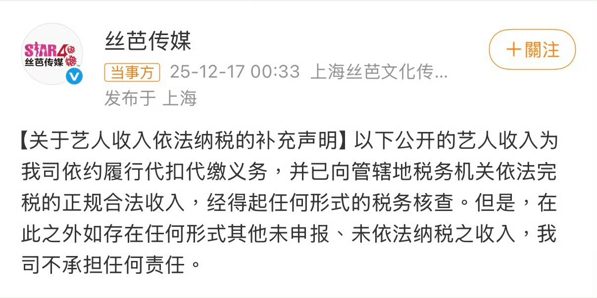 你看我前面说的吧,丝芭和鞠婧祎开撕这件事,不会有任何一方是赢家。鞠婧祎已经被丝芭指控存在严重经济犯罪,就跟前两天丝芭说的:「丝芭已为艺人依法缴纳税款,但艺人其它收入有无依法纳税,这与公司无关。」这个补充说明基本很清楚了,丝芭就是在一步一步引导大众往税务方向整鞠婧祎。所以这事不再局限于鞠婧祎收入多少的情况了。一个公司的销冠挣多少,那都是她该挣的。现在的问题是「钱是怎么分的、之前是如何管的、为什么突然被指控长期发放极低薪资」。就这,双方基本没披露。现在能看到的只有丝芭一边通过补充协议把鞠婧祎的收入拆解得七零八落,再以「未披露收入」为由扣上偷税漏税的帽子,这样规避了它自己可能存在的财务疏漏,又能借税务机关之手给艺人施压。这种操作在娱乐圈早有先例。他们不直接说「你偷税」,而是暗示「你可能有问题」,让舆论和监管部门顺着自己铺的路走。可一旦税务调查启动,丝芭自己也脱不了干系。毕竟双方合作多年,资金往来复杂,谁敢保证没有灰色地带?更何况,现在大家都在看着这两方开撕,一家公司一边享受着艺人带来的流量红利,一边用合同陷阱和舆论抹黑逼对方就范,它的口碑从今天开始就是一条分界线的存在。也因此我一直认为这场撕扯里没有真正的赢家。丝芭赢了官司可能会失去人心,鞠婧祎赢了自由也可能耗光口碑。但至少有一点可以确定,一家公司开始用「税务问题」跟前自家艺人撕架,这就说明它已经输了最基本的体面。丝芭指控鞠婧祎严重经济犯罪丝芭说鞠婧祎引导粉丝
