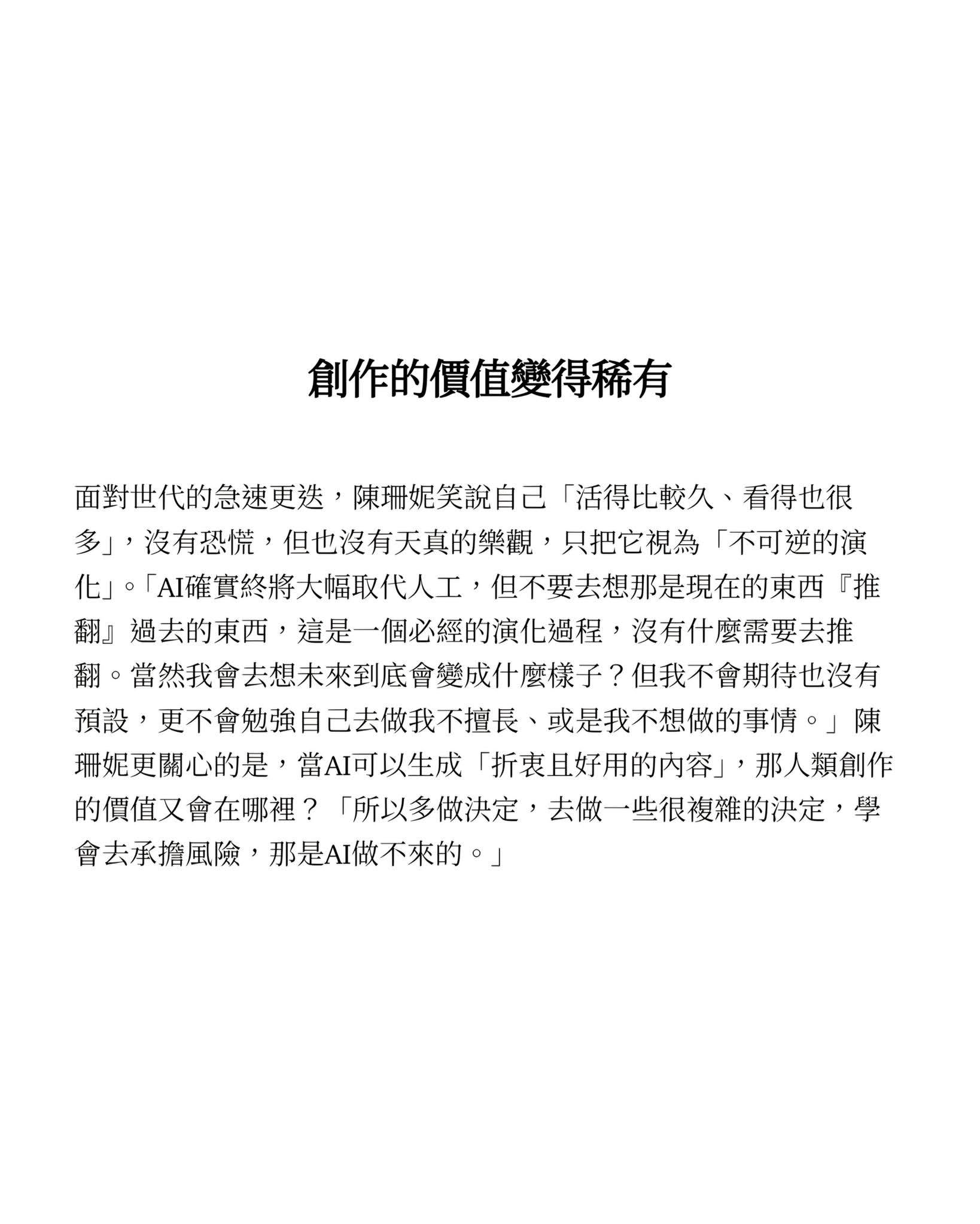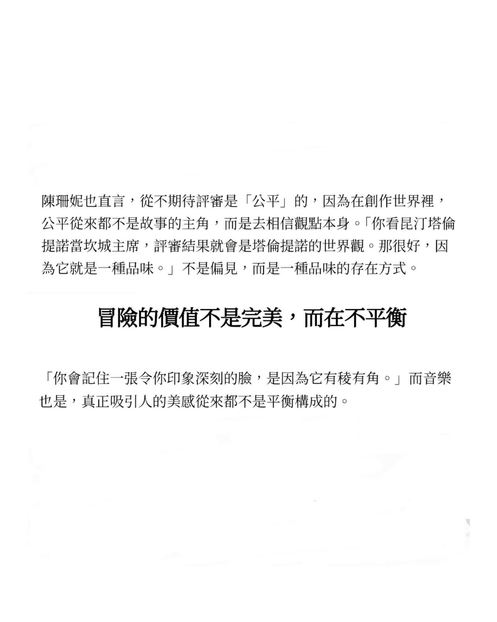 陈珊妮ELLE专访:「没有什么事情是『本来就是这样』,我们每天都应该要朝着更好的生活努力。」陈珊妮也直言,从不期待评审是「公平」的,因为在创作世界里,公平从来都不是故事的主角,而是去相信观点本身。「你看昆汀塔伦提诺当坎城主席,评审结果就会是塔伦提诺的世界观。那很好,因为它就是一种品味。」不是偏见,而是一种品味的存在方式。