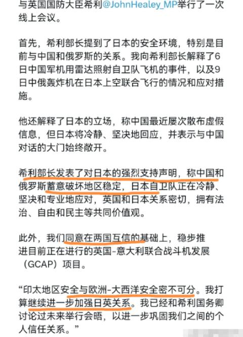 12月17日,日本防卫大臣小泉进次郎与英国国防大臣约翰·希利举行了线上会谈,希利声称,中俄正通过刻意的行为破坏地区稳定,英日两国之间纽带牢固,在法治、自由、民主等价值观上立场一致。 说白了,英国“拉偏架”的样子也太明显了,到底是谁在破坏地区稳定,估计小伙伴们都心知肚明。 若不是日本首相高市早苗说出“台湾有事就是日本有事”这样的话,中日两国的关系或许不会像今天这么紧张。 要知道,台湾一直都是中国的一部分,那日本却偏偏要把手伸过来。 如今英国站队日本,摆出了一副“好哥们”的姿态,这种“挑衅”行为咱们中方自然是不会惯着他们。 言论虽自由,但胡说八道可是要负责任的,可以这么说,倘若英日等国家继续在台海问题上发出不一样的声音,那中方很可能会让他们见识一下东方强国的真正实力。