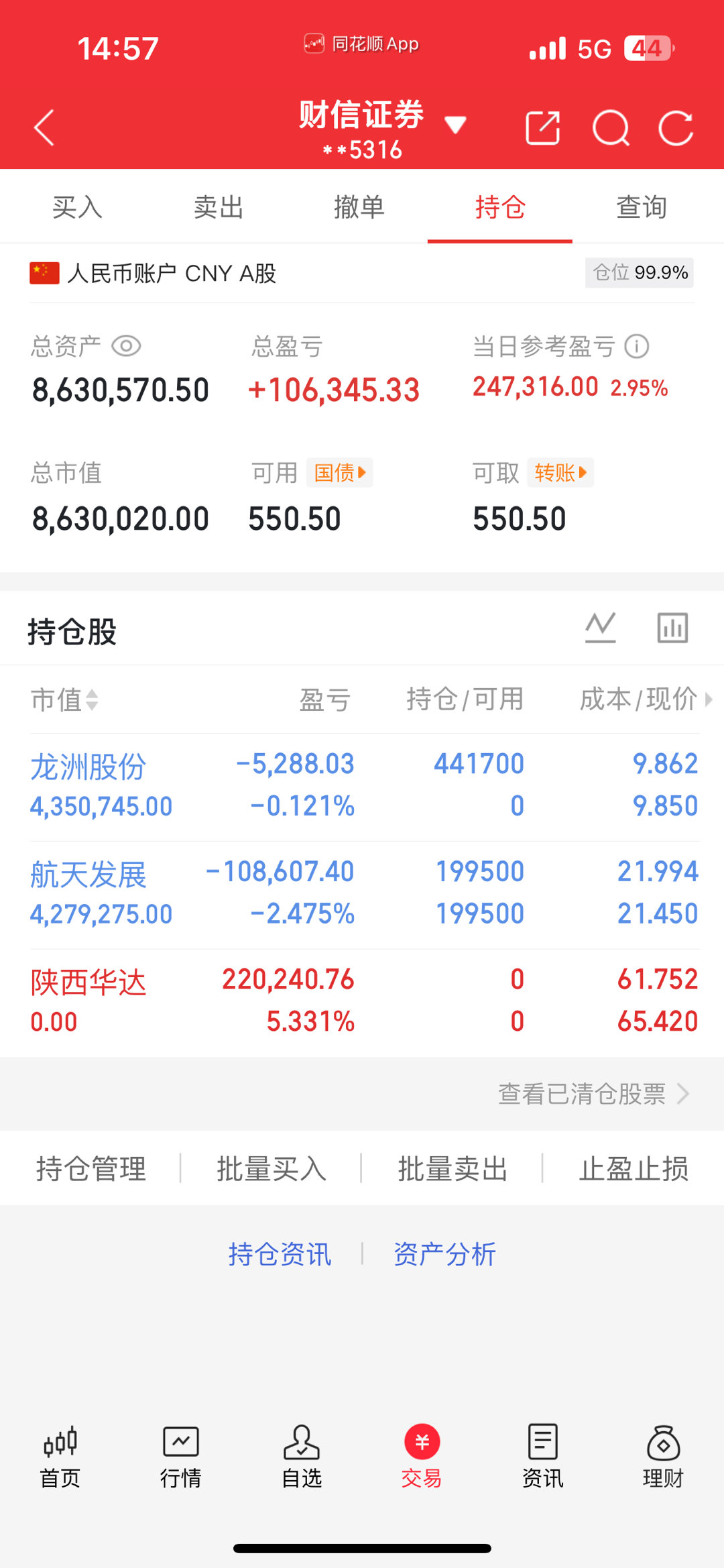 今天是12月18号星期四!菲菲股票操作之旅;今日卖出,陕西华达今日买入:龙洲股份继续持有:航天发展特别声明:我开实盘的目的主要是为了记录我对A股走势的思考和研判,并用于记录我自己的操作笔记,是我积累股票投资知识和反省操作失误的一个平台,绝不是读者朋友买卖股票的依据和理由,不具备投资建议,据此操作,需自行承担投资后果,股市有风险,投资需谨慎!!!看到的朋友点个赞,扣一波“888”支持菲菲,我会每天坚持发出自己的操作来!兄弟们,点赞富三代,评论美一生!