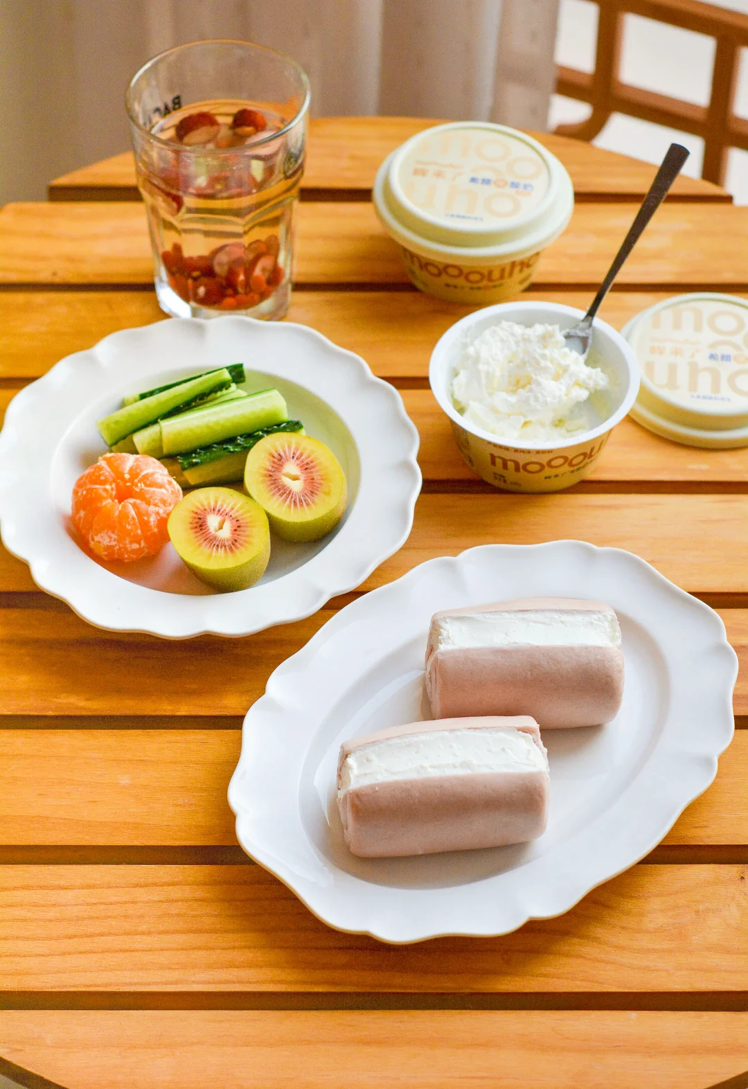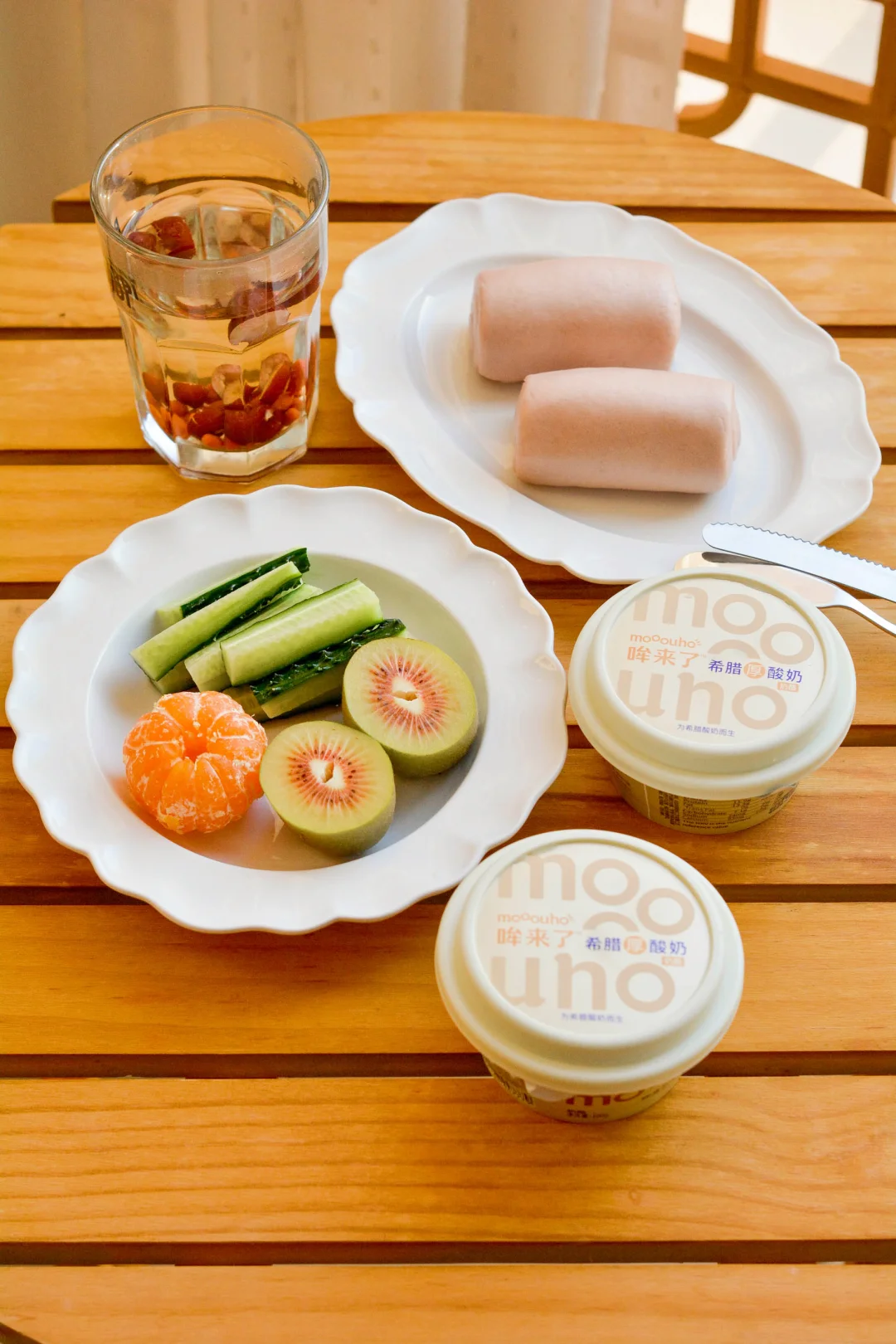 一人食午餐,不开火也能吃得香 💕提前蒸好的紫薯小馒头放冰箱冷藏 用微波炉加热一下就软乎了 一切两半但不要切到底 夹入“哞来了”希腊厚酸奶 爱吃的水果 蔬菜 红枣枸杞水 这不就妥了! “哞来了”希腊厚酸奶,新疆黄金奶源,1杯相当于5倍生牛乳,0反式脂肪酸,醇厚浓香,好像吃奶酪一般滑爽