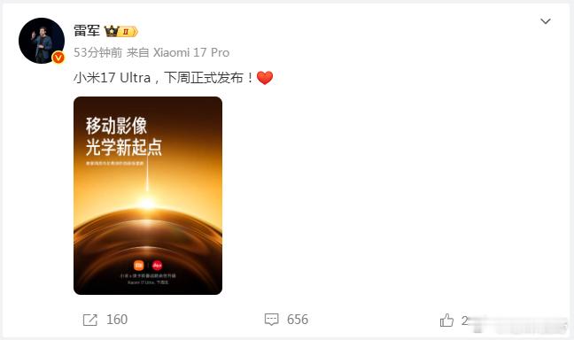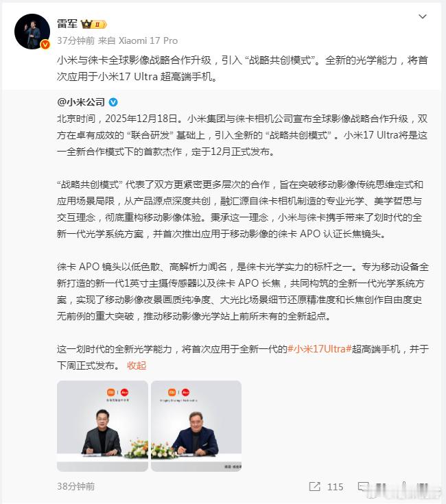 【雷军宣布小米17Ultra下周发布】 小米集团(01810)董事长雷军今日(18日)在微博发文表示,下周正式发布“小米17 Ultra”。雷军指出,小米与徕卡(Leica)全球影像战略合作升级,引入“战略共创模式”。全新的光学能力,将首次应用于小米17 Ultra超高端手机。 小米集团表示,“战略共创模式”代表双方更紧密更多层次的合作,旨在突破移动影像传统思维定式和应用场景局限,从产品源点深度共创,融汇源自徕卡相机制造的专业光学、美学哲思与交互理念,彻底重构移动影像体验。双方携手带来全新一代光学系统方案,并首次推出应用于移动影像的徕卡APO认证长焦镜头。小米与徕卡合作升级