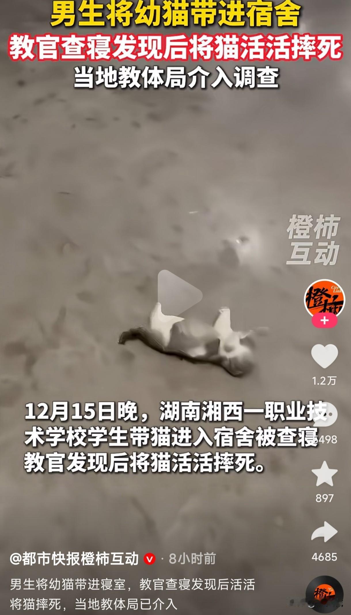 湖南湘西一职业技术学校学生带猫进入宿舍,被查寝的教官发现后居然当着学生的面把猫活活给摔死了? 俗话说无规矩不成方圆,任何事物都有它的规则制度,但规则制度不也是人制定的吗?规则制度是死的人不是活的吗?难道制定规则制度的有些人也是死的,对于一只猫那也是生命,为什么要把它活活摔死?批评教育肯定是必须要的,但这种做法是不是太极端了?不管从哪方面来说它也是一条命不是吗? 教官不是应该以德服人吗?这种连生命都不敬畏的人还配当教官吗?对于一只猫都如此残忍,那平时对待人岂不是更狠?