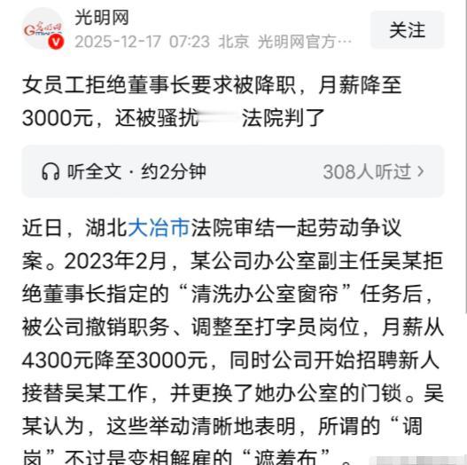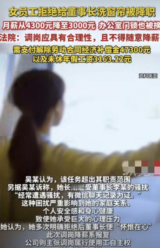 “色欲熏心?”12月17日报道,湖北大冶,女子本是办公室副主任,董事长指定让她“清洗办公室窗帘”,女子果断拒绝,却被降职到打字员,4300元月薪也降到3000元,还招新人替代女子工作,甚至换了女子办公室的门锁,女子这个憋屈,因为董事长经常给她发骚 扰信息,她多次明确拒绝,却遭董事长调岗降薪报复,女子一气之下告上法院,法院作出公正判决。 女职工吴某,从2012年6月进这家建设公司,一开始就是普通文员,干到后来做上了办公室副主任,月薪4300,整整干了11年,业务熟、人也老实,算是公司里的老人了。 可这11年里,她一直被董事长李某恶心,李某老给她发那些不正经的暧昧消息,还影响到她家庭,她多次明确回绝,态度很坚决。 到了2023年2月1日,李某突然打电话给她,让她去把办公室窗帘洗了,以前这种琐事都有专门的人干,根本不是她的岗位内容。 她当场就说,这不属于自己的工作范围,结果李某一句“你不做就辞职”,甩完电话就挂。 吴某没有退让,坚持认为这是乱指派活,紧接着第二天,公司马上搞了个专题会,下手特别快:直接撤掉她办公室副主任职务,把她手里的公章、仓库钥匙收回,考勤和档案管理权限也都取消,把她调去当打字员,工资从4300降到3000,还书面通知她三天内必须去新岗位报到,不去就按旷工处理,连旷三天就按自动离职算。 与此同时,公司还一边发布招聘信息,找人顶替她原来的岗位,一边把她原办公室的门锁给换了,意思很明显,就是想把她“逼走”。 吴某心里清楚,这根本不是什么正常调岗,就是因为她一直拒绝李某的骚扰,这次又不肯听他的话,所以遭了打击报复。 她和公司反复沟通没结果,就把公司告上法庭。公司在法庭上的说法是:我们有用工自主权,可以调整岗位,吴某是不服从管理,新岗位工资跟原来“差不多”,不存在侮辱性。 吴某把董事长以前发的那些骚扰微信记录拿了出来,还把自己历年的岗位职责文件也给法官看,证明洗窗帘从来不是她该干的活,这次调岗降薪就是报复。 法院审理后认定:公司当然可以在合理范围内调整员工岗位,但不能乱来,更不能随便降薪。 因为员工拒绝干明显超出职责的杂活,就把人职务拿掉、工资压低,这已经属于没按劳动合同约定提供正常劳动条件。 最后法院确认,双方自 2012 年 6 月到 2023 年 2 月的劳动关系解除,由公司支付吴某经济补偿金 47300 元,外加她没休完年假的工资3163.22元,一共要赔50463.22元。 至于性骚扰那部分,法院也提到,这对理解案情背景很重要,但劳动争议案主要处理的是劳动合同、工资待遇这些,所以判决里重点落在劳动关系和补偿上。 总体来说,吴某这仗算是打赢了,没有让董事长那点“霸王脾气”占上风。 很多网友看完都气不过:一个干了 11 年的老员工,说打压就打压,就因为不陪老板演戏、不帮他洗窗帘?这事儿提醒大家,有的管理层把“用工自主权”当成自己为所欲为的挡箭牌,觉得员工必须无条件听话,甚至拿调岗降薪当惩罚工具。 但法律早就划线了:用工权利不是特权,既不能骚扰员工,也不能随意报复。 像吴某这样,遇到骚扰要留好证据,遇到不合理调岗降薪就要敢于维权,走法律程序,别让这种职场霸凌心安理得地继续下去。 对此你怎么看? 信源:光明网