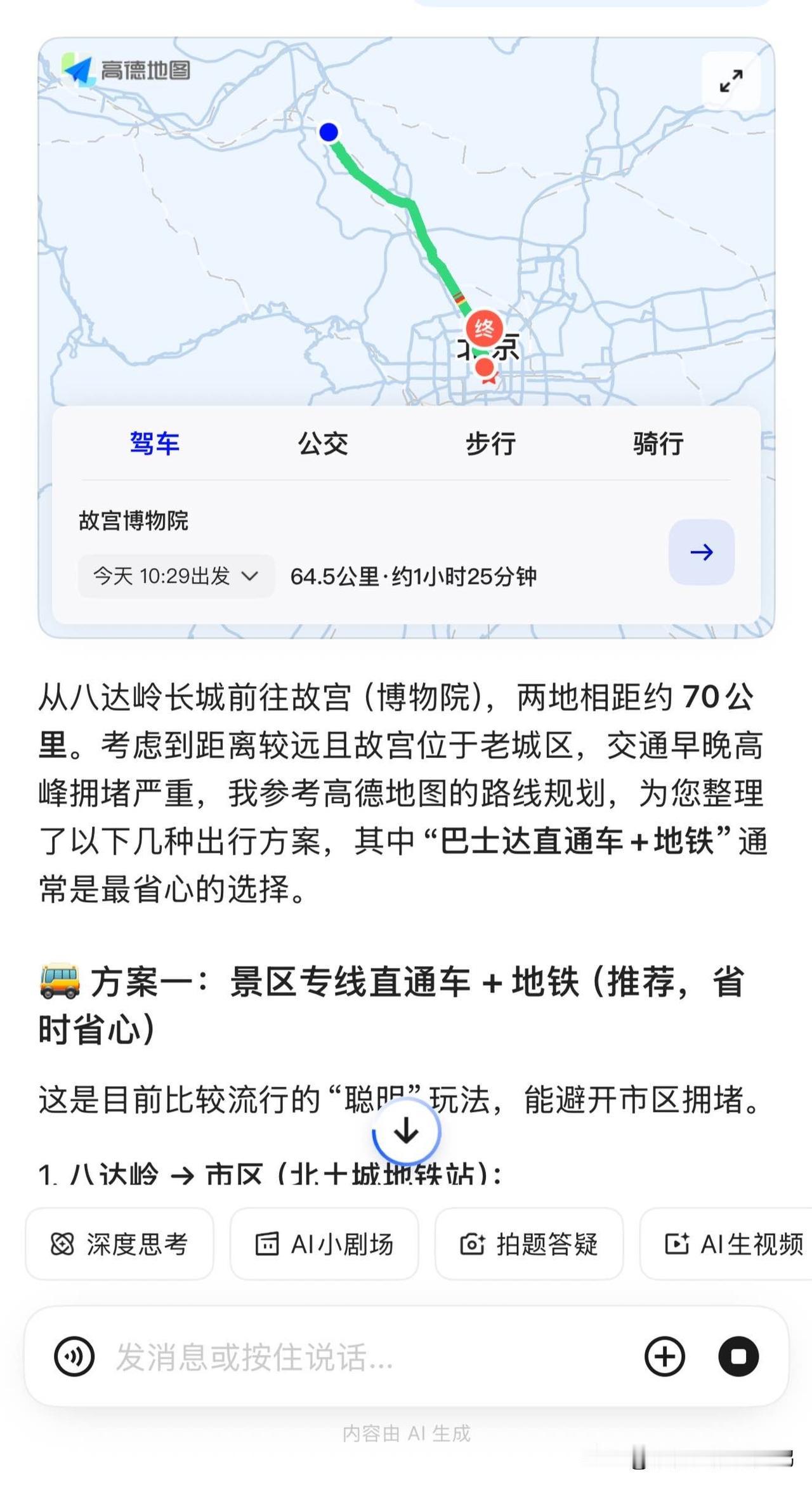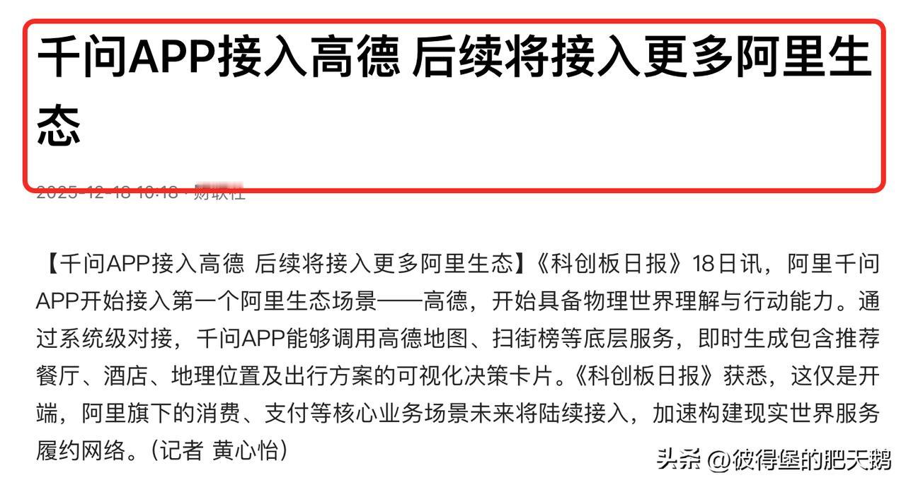 2025年即将结束,中国社会传来一条重磅消息,和咱老百姓的生活有关系,值得关注! 马上要元旦了,不少人请3天能过上8天的假期。这么长的假期,不少人要出去玩。在这个过程中最难受的是,规划路线,看出行攻略,和老婆、女友出去玩的时候甚至会因为旅行规划问题吵架。 但现在好了,看到新闻,千问APP接入高德了,这些麻烦的事儿,和千问说一句话就能搞定了。 比如你在北京的八达岭长城,想去故宫,过去可能要自己手动输入去看看各种交通方式的时间,但现在直接问千问APP,它就可以给你规划出路线,并给出最合理的建议。 换句话说,现在千问接入高德之后,出行这个事儿就成了发个消息的事儿,非常的方便简单。出行还有了主心骨,再也不用吵架了。 这个事儿,对于普通人来说,是改善出行体验,便利生活的一小步,但对于阿里来说,这是宏大战略意图的体现。 今年阿里打了三场战,分别是淘宝闪购、高德扫街榜、千问APP,而从现在千问APP接入高德来看的话,阿里这是要不同战略之间形成战略呼应,把AI应用辐射到各个生态上。 逻辑很简单,千问能接入高德,那么未来还可以接入淘宝、接入淘宝闪购等一系列的平台,从而推动社会的发展,让普通人生活更方便。 之所以这么说,是因为过去一段时间里面,千问APP做出了一系列提升人们幸福感的升级。比如能通过千问轻松做出PPT,比如它能帮助家长给孩子讲题,捋清知识点。 通过这些,我们不难发现,阿里高德接入阿里只是开胃菜,后面估计还会有更多AI应用落地方面的动向,对于我们普通人来说,这是一个利好的消息。 因为随着 AI不断落地,除了让生活更便利之外,还会衍生出新的机会,抓住这样的机会,逆天改命都有可能!