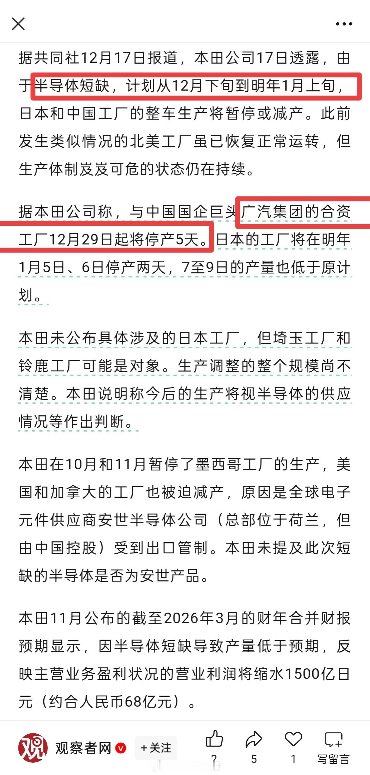 本田中国工厂将停产 本田12月下旬到明年1月上旬,将在日本和中国工厂暂停或减产,具体安排:1.广汽本田合资工厂12月29日起停产5天2.日本本土工厂1月5-6日停产,7-9日减产原因说由于半导体短缺,之前类似情况的北美工厂虽已恢复正常运转。汽场全开
