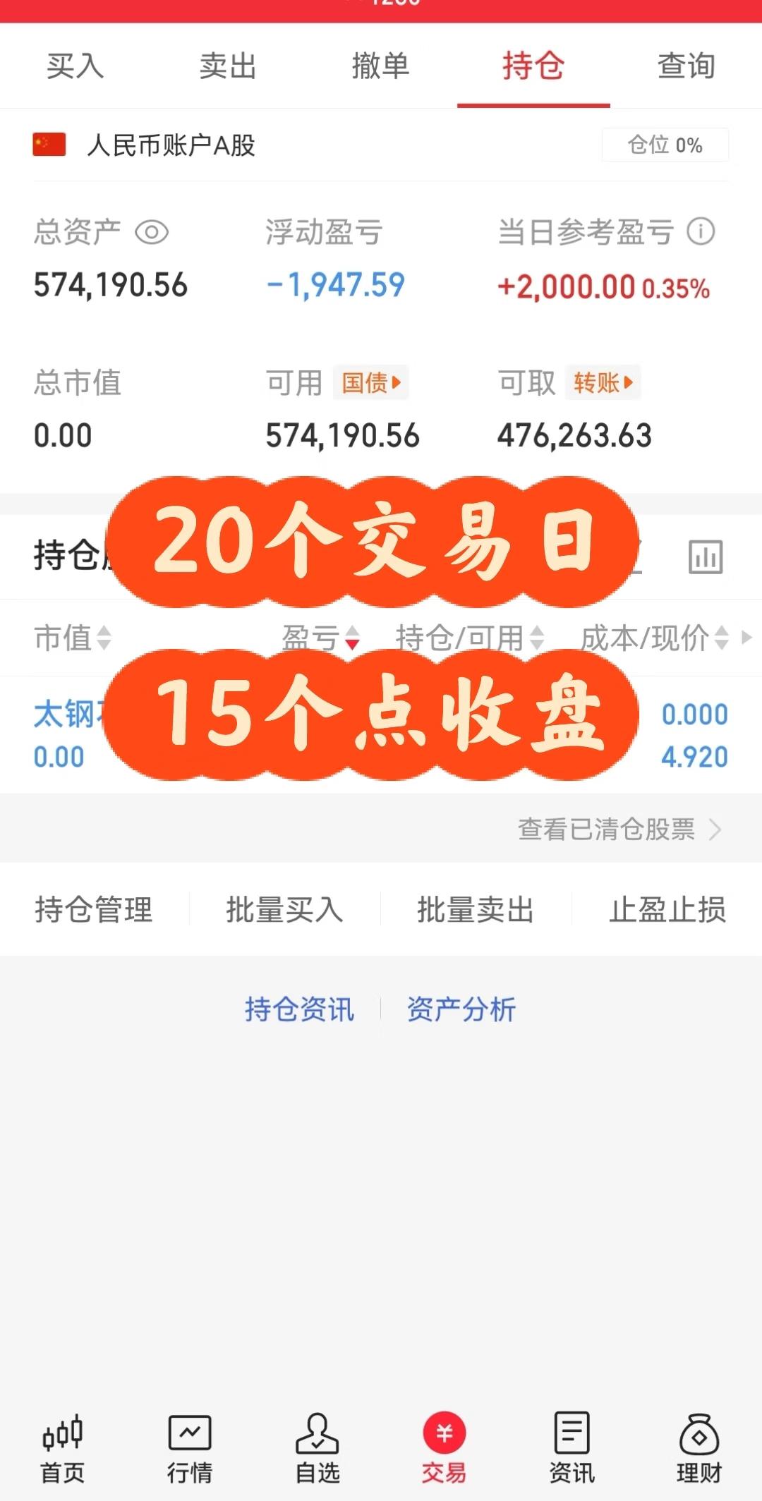 每月目标3个点实盘—第20天,实现收益15个点。 每20个交易日定位一个周期, 盈利提取, 明天开启新的周期!每日盈亏记录 投资回血日记 股民实盘日记 实盘炒股