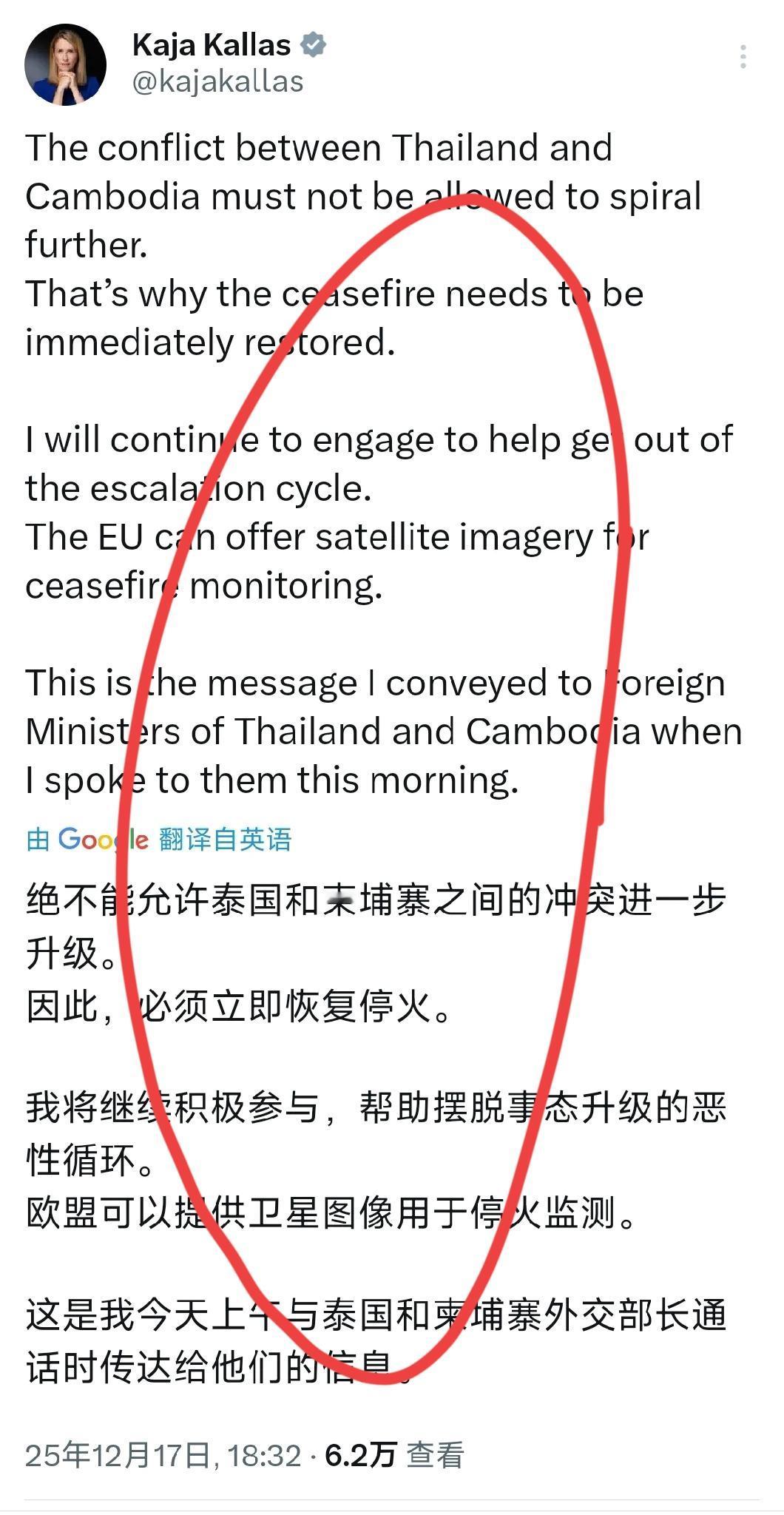 12月17日晚,欧盟那位叫卡拉斯的外交官发话了,说泰国和柬埔寨的冲突不能再升级了,必须立即停火。他还说自己上午分别跟两国的外交部长通过电话,提议用欧盟的卫星帮忙监控停火情况。 但亚洲这边不少人不买账。觉得欧洲自己日子也不好过,经济差、社会问题多,这时候跑来管东南亚的事干嘛。泰国和柬埔寨两国都说,他们之间的矛盾完全能自己谈,用不着外人指手画脚。 欧洲那边总爱自称促进和平,可这次帮派调解的行为被质疑是想刷存在感。反正这事儿挺尴尬的,欧洲管不管都是问题,亚洲国家现在越来越反感外来干涉了。