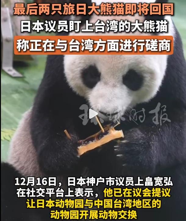 日本议员竟提议去台湾借大熊猫。近日,日本最后两只旅日大熊猫“晓晓”“蕾蕾”将于2026年1月底返回中国,这将是日本自1972年来首次无大熊猫。 于是,神户市议员上畠宽弘借此于12月16日提议,要求日本动物园与台北动物园“交换动物”,目标直指台北动物园的三只大熊猫(“团团”“圆圆”及其后代“圆仔”“圆宝”)。其借口是“台湾熊猫系大陆赠送而非租借,无需中方同意”。 但这名日本所谓的议员可能不知道,台北动物园的大熊猫是2008年大陆中央政府赠台礼物,所有权归属中国,任何跨国转移需中央政府批准。日本此举试图将台湾视为“独立实体”,公然挑战“一中原则”。 根据《濒危野生动植物种国际贸易公约》(CITES),大熊猫作为中国特有物种,国际转移必须经中国政府许可,日方提议涉嫌违法。 日本民众对熊猫情感深厚,告别期间出现“排队4小时仅参观1分钟”现象,甚至衍生“熊猫失落症”。超70%日本民众支持争取新熊猫,但由于高市早苗的言论造成的中日关系紧张,让日本动物园争取新的熊猫成为泡影。 台湾现在的这两只大熊猫,是当年大陆赠送的,一名团团,一名圆圆,取得是团圆之意, 这名字是2006年的春节联欢晚会上,一亿多人次观众投票选出来的。 然后两只大熊猫还生有两只幼崽,圆仔,圆宝。 这日本要是敢提出借这几只熊猫,赖清德说不定真的敢借,那真的是败家子了。