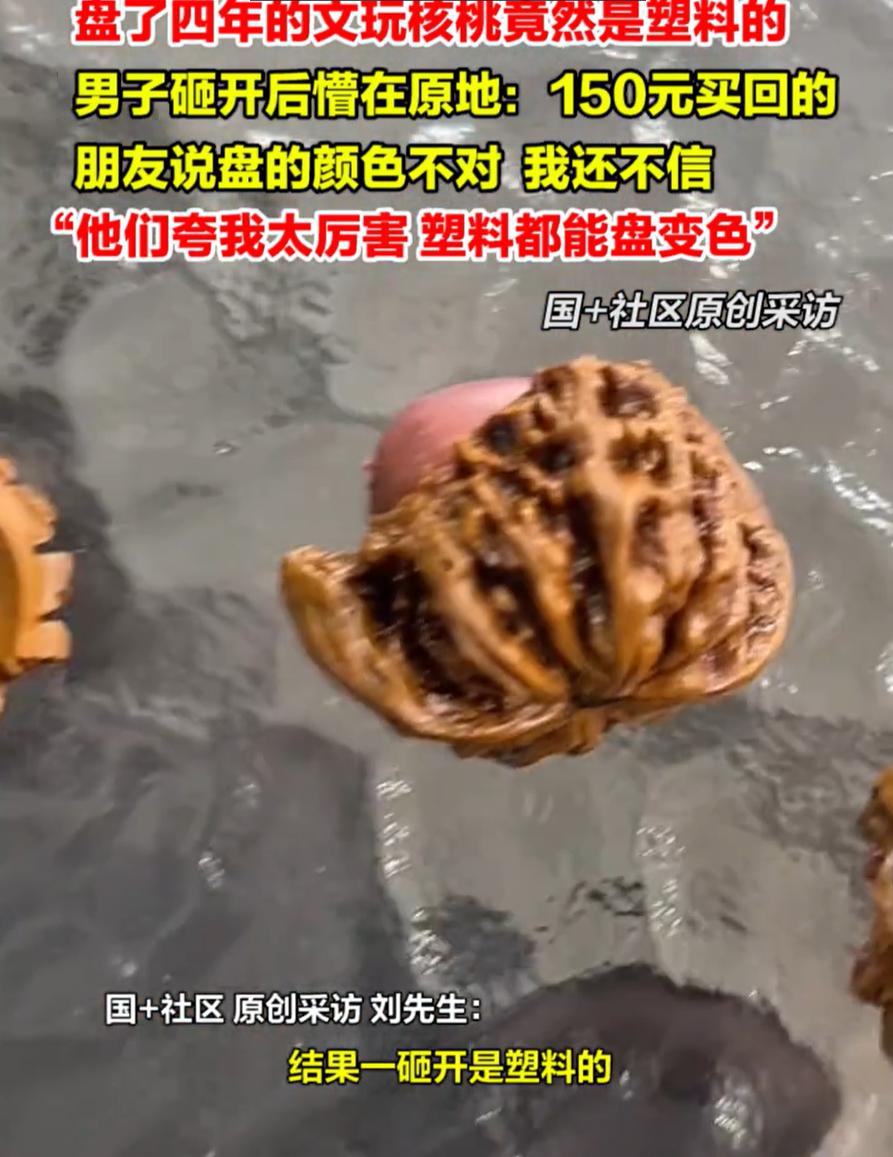 伤害性不高侮辱性极强!河北唐山,男子盘了四年文玩核桃,结果给朋友展示时,对方一眼就指出他这个有问题,一开始男子还不信,结果砸开一看,才发现是塑料的,盘了四年就算了,当初他还花了1500块钱购买的 刘先生介绍,那时候他花了1500块钱,入手了一对文玩核桃。这价格不算便宜,但他觉得值,东西好看,拿在手里也舒服。从那以后,这对核桃就成了他的心头好,每天拿在手里盘玩,一玩就是四年 直到前不久,一位懂行的朋友来家里做客,看见了这对核桃。朋友拿在手里端详了一会儿,表情有点微妙,犹豫了一下还是开口说,感觉这核桃的颜色和质感不太对劲 一开始刘先生还不信,但看到朋友言之凿凿的样子,再加上对方确实很专业,这也让他心里不太确定 朋友离开后,他左思右想,最后心一横,决定砸开看看。反正也盘了这么多年,正好想换对新的。这一砸,真相大白,里面压根不是核桃仁,而是实心的塑料 看到这一幕,刘先生也是又气又笑,气的是花了这多钱发现被骗了,笑的是朋友都调侃他厉害,塑料都能盘变色 有网友说:你这还好,之前认识个朋友,在产地买小海马泡酒,都喝十二年了,瓶碎了,发现是塑料的小海马。塑化剂喝了十二年 其实这类事有个共同点,不是贪便宜,也不是存心捡漏,而是太相信经验和感觉。文玩也好,收藏也好,时间只能证明你一直在玩,证明不了东西一定是真的。塑料能变色,合成材料能包浆,外观这件事早就不再是判断真假的标准。很多人吃亏,往往就吃在看得多摸得多,却没走过专业渠道这一步 文玩这东西,玩的是心态,不是证明自己眼力多准。真要下手贵的东西,来源、材质、检测比感觉重要。日常把玩,当个乐子就好,别指望每一件都能升值,也别把真假当成全部意义。盘塑料四年不丢人,丢人的是明明踩过坑,下次还只信手感不信常识