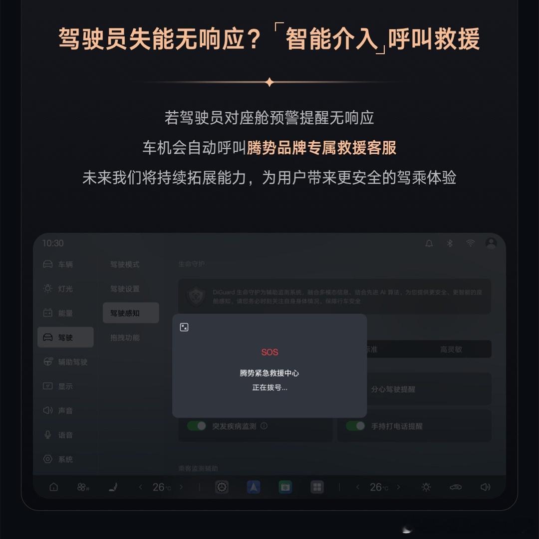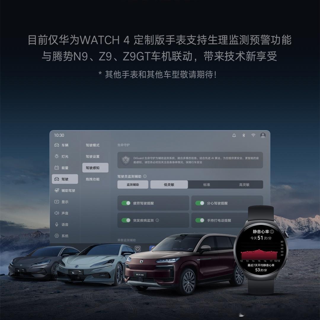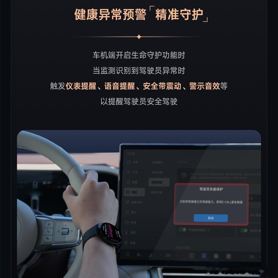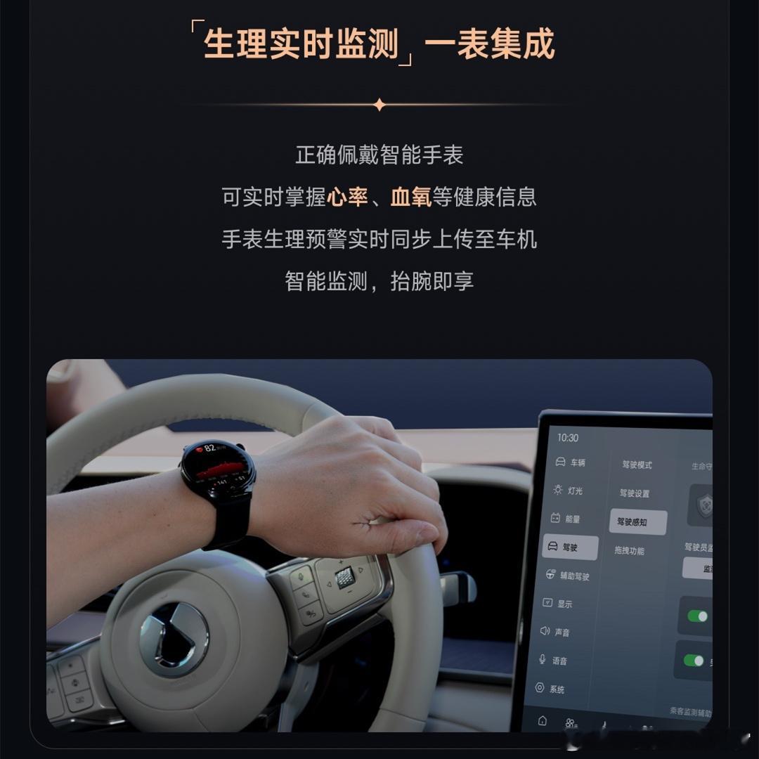 比亚迪的智能座舱最近新出了一个DiGurad生命守护系统,首批支持的车型包括:腾势N9、Z9以及Z9GT。上述车型的车主们,在佩戴定制版的华为手表后,可实时检测心率、血氧等健康信息,并将手表的生理预警同步上传至车机。当监测到驾驶员生理体征异常时,车辆会触发仪表提醒、语音提醒、安全带震动、警示音效等,以提醒驾驶员安全驾驶。若驾驶员对座舱预警提醒无响应,车辆还会自动呼叫腾势品牌的专属救援客服。