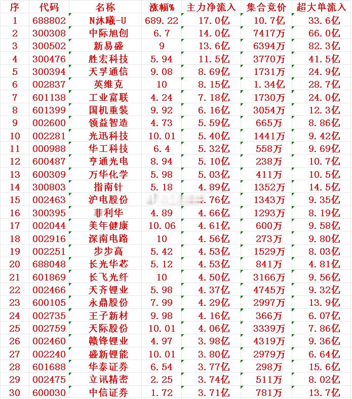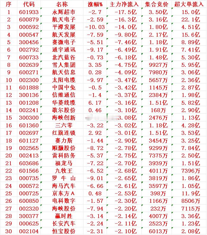 12月17日收盘,主力资金,已经大幅卖出的30名单:永辉超市:净流出17.5亿元航天电子:净流出16.3亿元平潭发展:净流出14.0亿元航天发展:净流出9.80亿元赛微电子:净流出7.46亿元通宇通讯:净流出6.49亿元北汽蓝谷:净流出6.18亿元雪人集团:净流出4.75亿元航天信息:净流出4.09亿元太阳电缆:净流出3.47亿元中国中免:净流出3.42亿元信维通信:净流出3.37亿元华菱线缆:净流出3.16亿元歌尔股份:净流出3.10亿元海峡创新:净流出3.08亿元12月17日收盘,主力资金“大幅买入”的30名单:N沐曦-U:净流入17.0亿元中际旭创:净流入14.0亿元新易盛:净流入13.6亿元胜宏科技:净流入11.5亿元天孚通信:净流入8.69亿元英维克:净流入8.15亿元工业富联:净流入7.18亿元国机重装:净流入6.16亿元领益智造:净流入5.59亿元光迅科技:净流入5.40亿元华工科技:净流入5.32亿元亨通光电:净流入5.10亿元万华化学:净流入5.03亿元指南针:净流入4.89亿元沪电股份:净流入4.76亿元