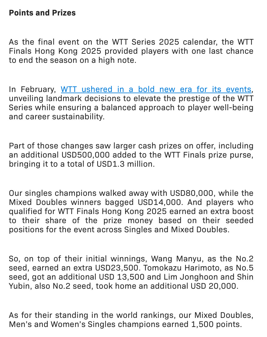 WTT总决赛奖金中额外增加50万美元,使奖金总额达到130万美元。获得2025香港WTT总决赛资格的球员根据他们在单打和混合双打赛事的种子位置获得了额外的奖金份额。