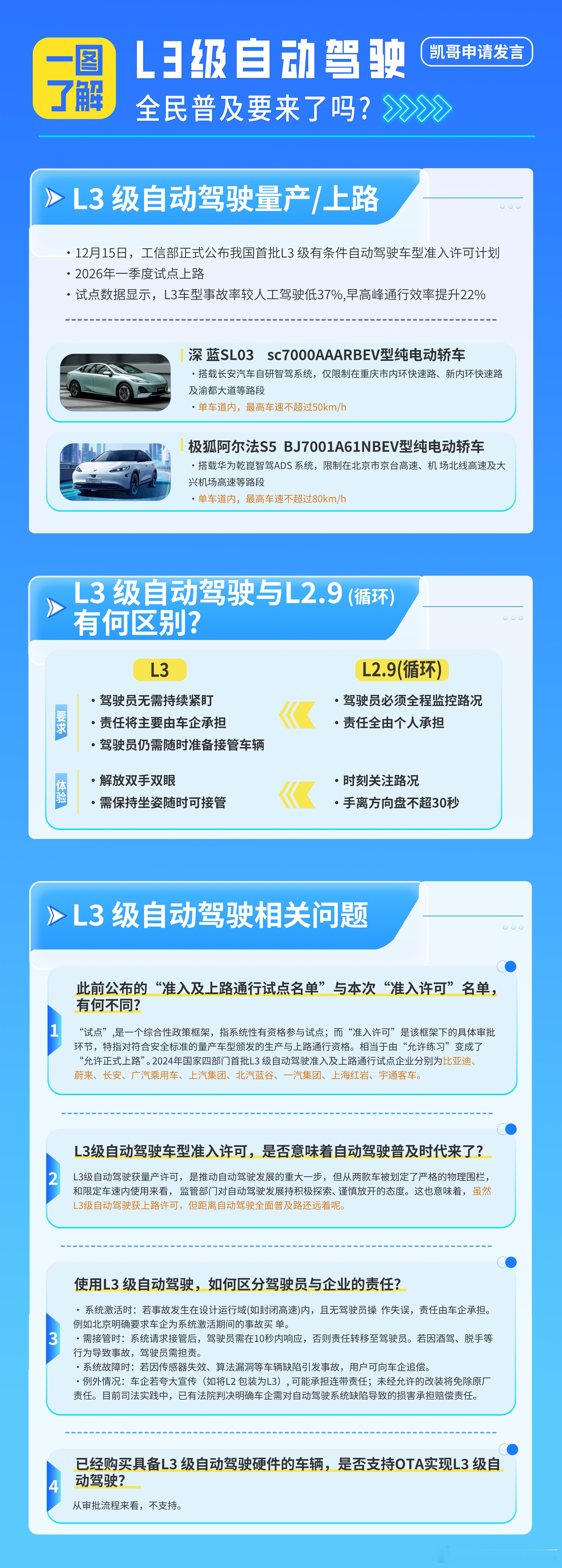 l3级自动驾驶比亚迪汽车理想汽车 L3 级自动驾驶最大的区别,就是驾驶员无需持续紧盯,解放驾驶员双手双眼,但驾驶员仍需随时准备接管车辆。除了体验上变化,L3 最大的改变是责任将主要由车企承担。目前公布的两款L3 级自动驾驶准入许可车型,均为测试车型,和以往“允许练习”的车型不同,它们正式进入了允许上路的阶段,从物理上看是自动驾驶领域的重大突破。大家最关系的责任划分,当L3 系统激活时,若在设计运行域发生事故,且无驾驶员操作失误,责任由车企承担。但当系统请求接管时,驾驶员依然要在 10 秒内接管,都则责任转移至驾驶员。这么看,虽然L3 级自动驾驶可上路,但距离自动驾驶全面普及,还有很长的一段路!