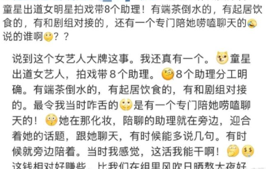 曝童星出道女明星拍戏带8个助理!其实也没什么的,她至少给 6 个人增加了就业机会,这样不是挺好的吗?现在大环境就业困难