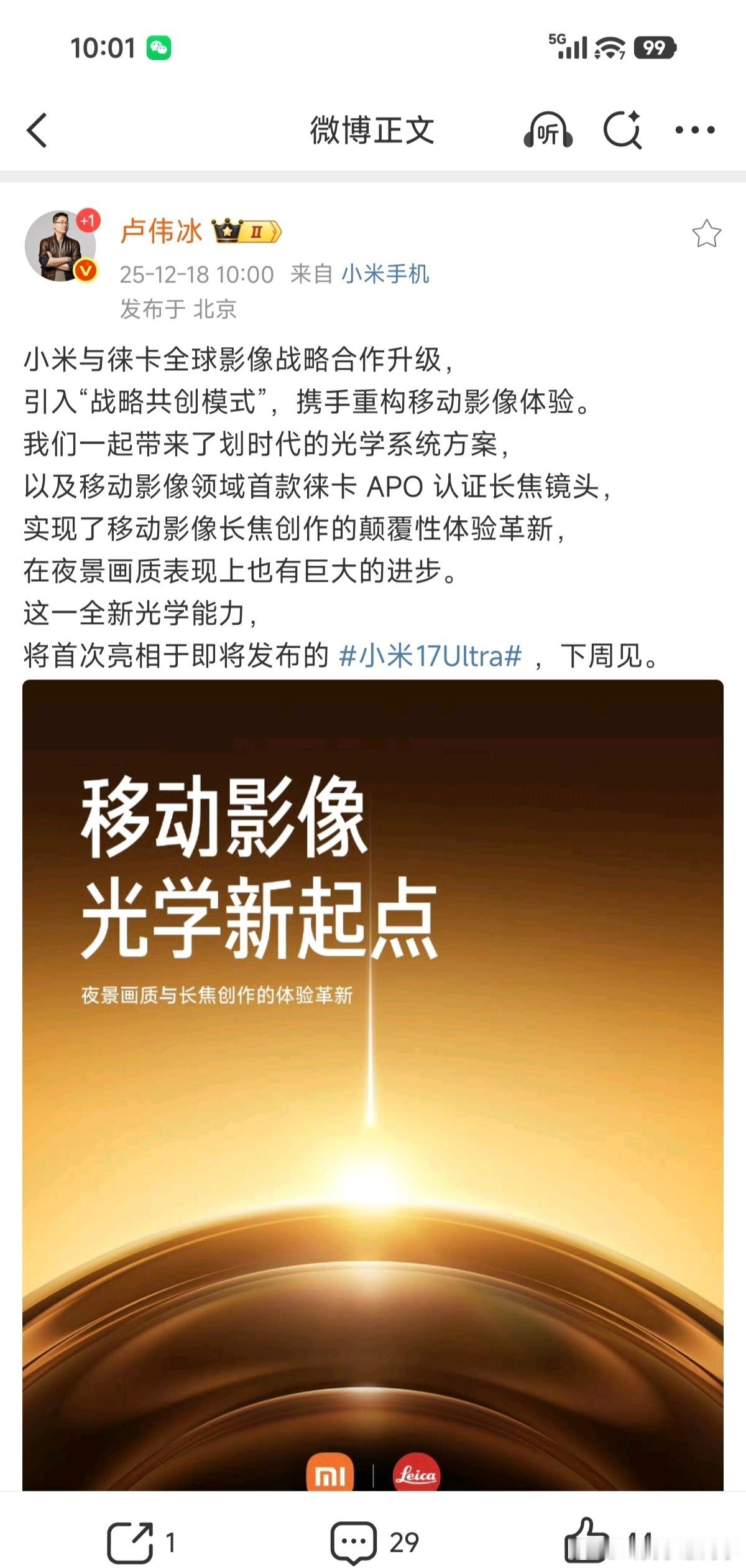 小米17Ultra发布时间定档了! 作为年末压轴的顶级影像旗舰,这次小米徕卡全球影像战略合作升级,在移动影像的光学素质上进一步发力。主摄直接上了一英寸大底,搭配三星2亿像素潜望长焦,还拿下了徕卡APO认证长焦,可以支持3-7X连续光学变焦,拍摄质感更真实的同时细节更全面。再有徕卡光学镀膜的加持,夜景纯净度显著提高的同时还能抑制眩光,即便光源复杂场景也不怕。照这配置,这波又是移动影像大突破了~就是不知道现在内存涨价幅度这么大,小米 17Ultra定价会不会有变动。坐等下周发布会~