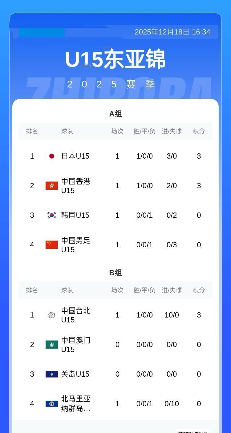 U15东亚杯积分榜:U15国足小组积分垫底 周六将战韩国 12月18日 U15东亚杯首战 U15国足0-3日本U15无缘开门红 韩国U15今日上午0-2中国香港U15 下一轮中国U15与韩国U15的比赛将在12月20日周六15:00进行。