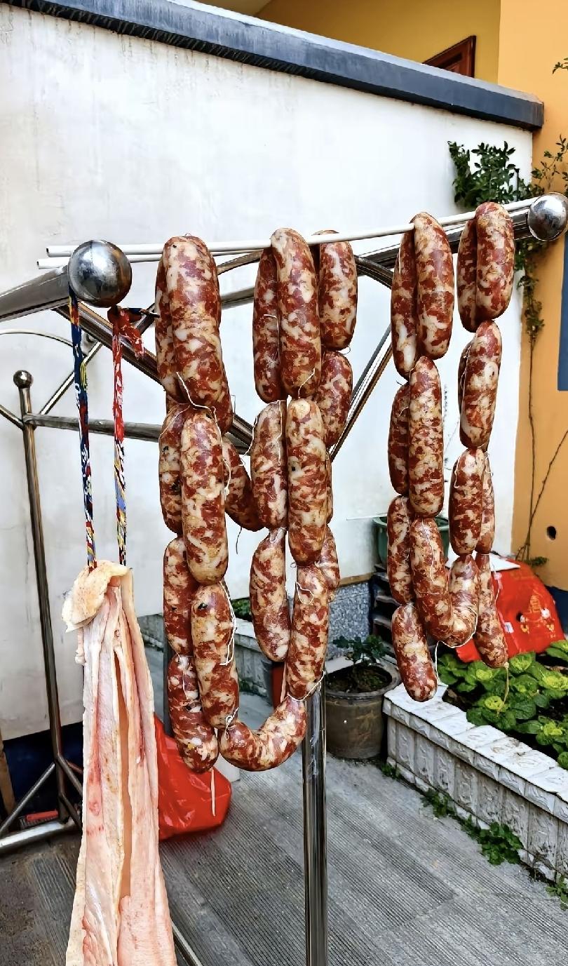 我每年凉香肠都是在自家北阳台屋里窗户跟凉的,窗户日夜开着,今年的又快凉好了。