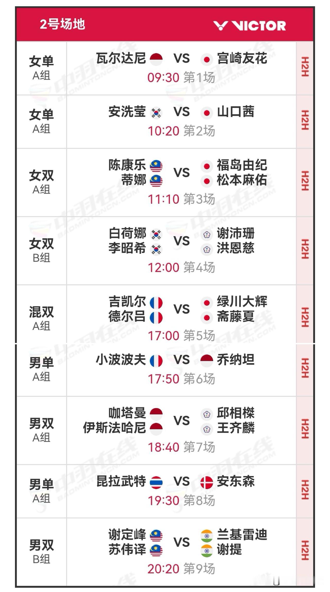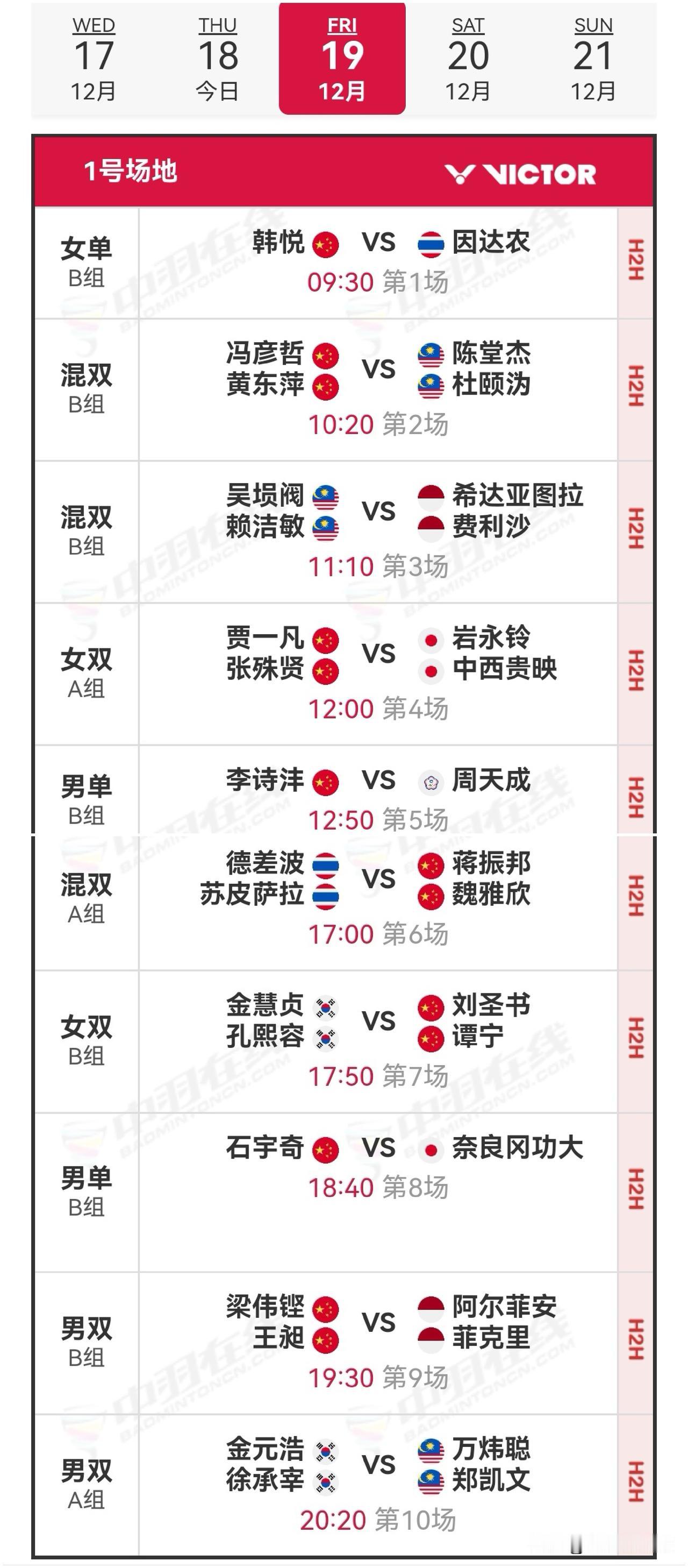 12月19日世界羽联年终总决赛小组循环赛对阵安排 明日将进行最后一轮小组赛,白天场于09:30开启,晚场则在17:00开场,届时将有两块场地同时进行比赛。国羽都安排在一号场地,明日国羽面临的皆是硬仗,石宇奇对阵奈良冈功大,李诗沣对战周天成,韩悦迎战因达农。详细对阵安排如下: 羽联总决赛 羽球赛程 羽球总决赛 羽毛球 国羽赛程 羽毛球爱好者 羽毛球比赛 石宇奇