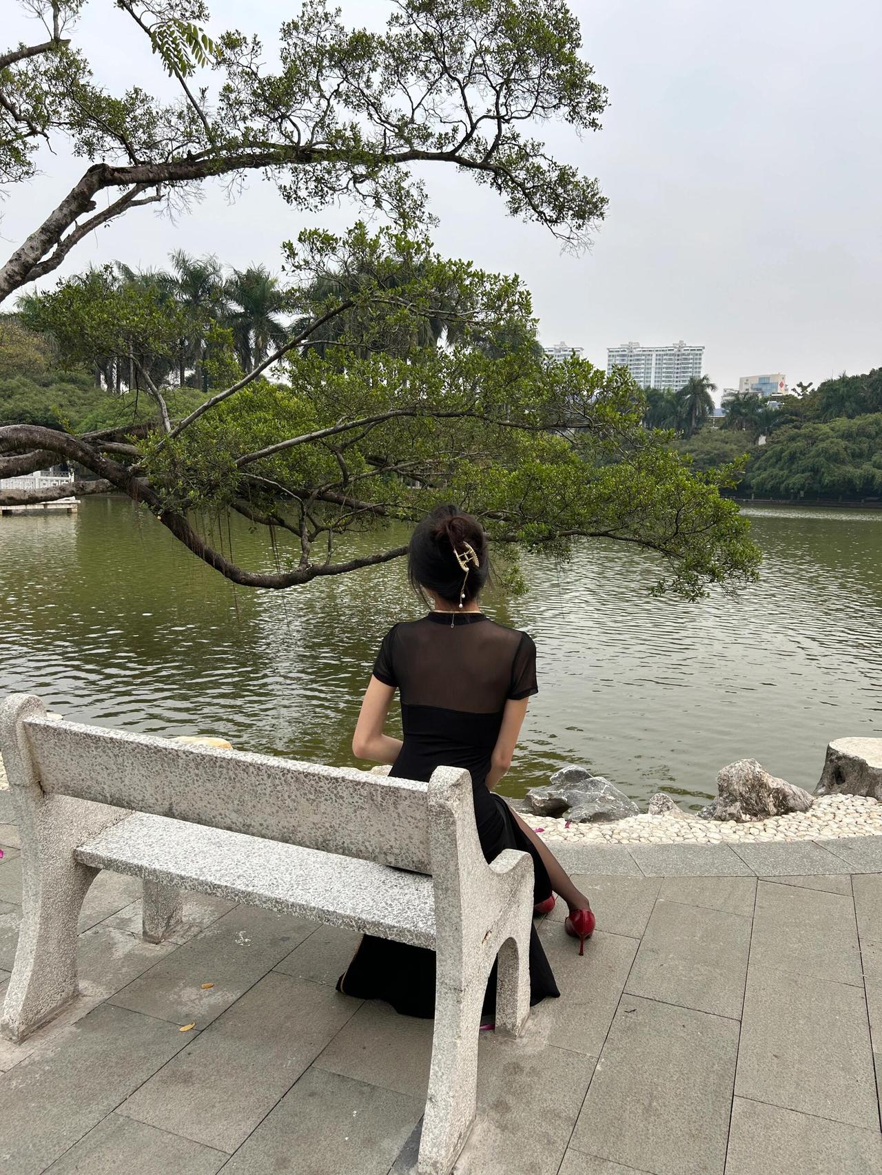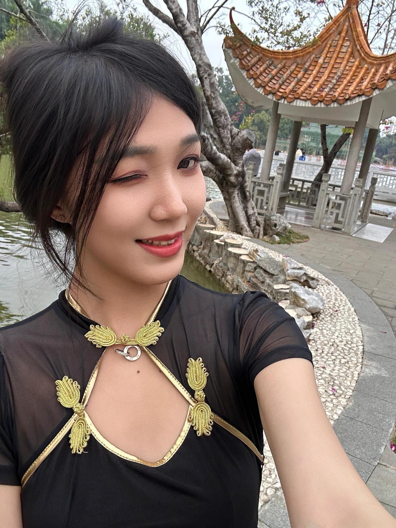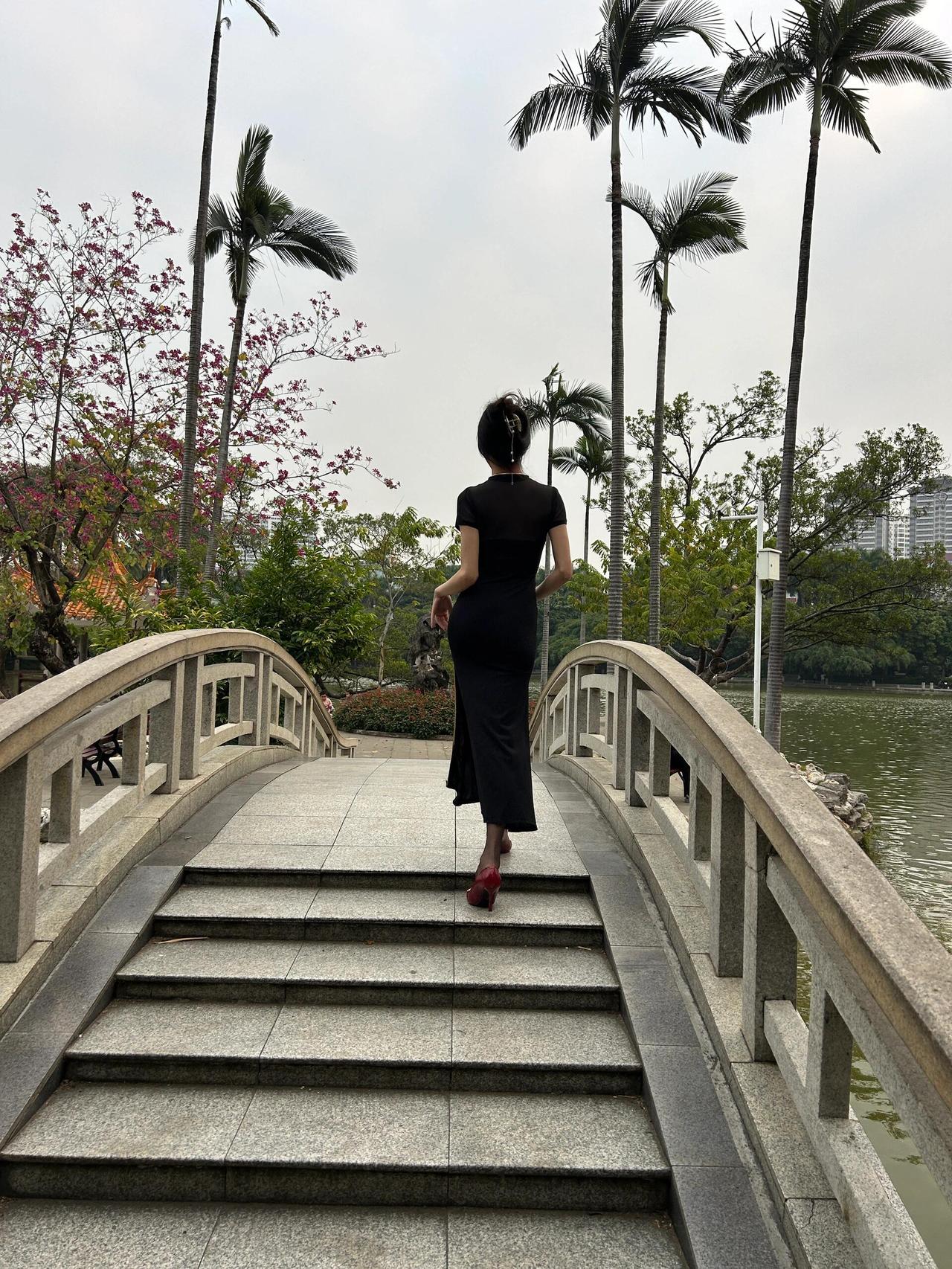 岭南的风,绕着旗袍打了个结。 黑纱兜住三分软,金纹是从老绣片里捡来的星子,落在领口,亮得克制。红鞋磕在青石板上,声响轻得像檐角的风铃,摇落半阙闲词。 风解开结的时候,裙角扫过石桥的苔藓,沾了点水汽的凉。亭下的影子被拉得长,和飞檐的轮廓叠在一起,像幅没干透的水墨画。 我站在风里,不说话。风也不说话,只把人间的软,悄悄揉进这一身东方骨相里。