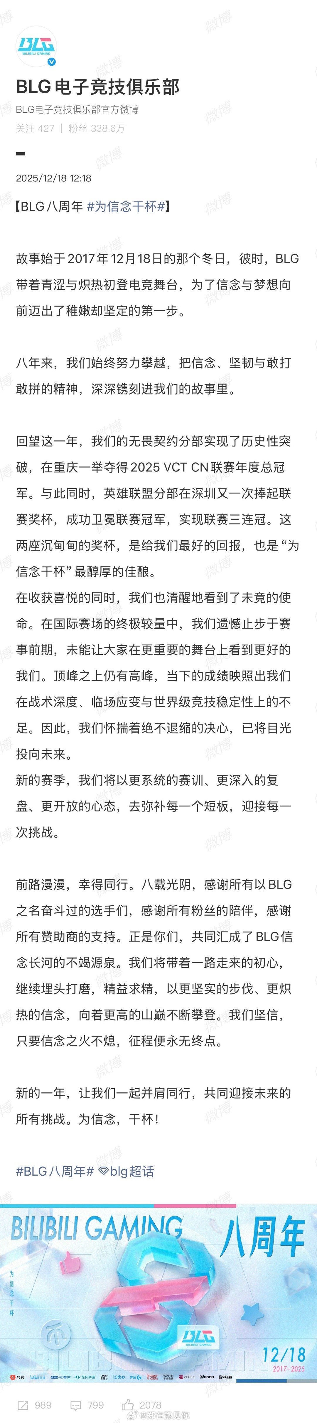 BLG8周年 故事始于2017年12月18日的那个冬日,彼时,BLG带着青涩与炽热初登电竞舞台,为了信念与梦想向前迈出了稚嫩却坚定的第一步。八年来,我们始终努力攀越,把信念、坚韧与敢打敢拼的精神,深深镌刻进我们的故事里。acg优创官全网热点共创计划英雄联盟