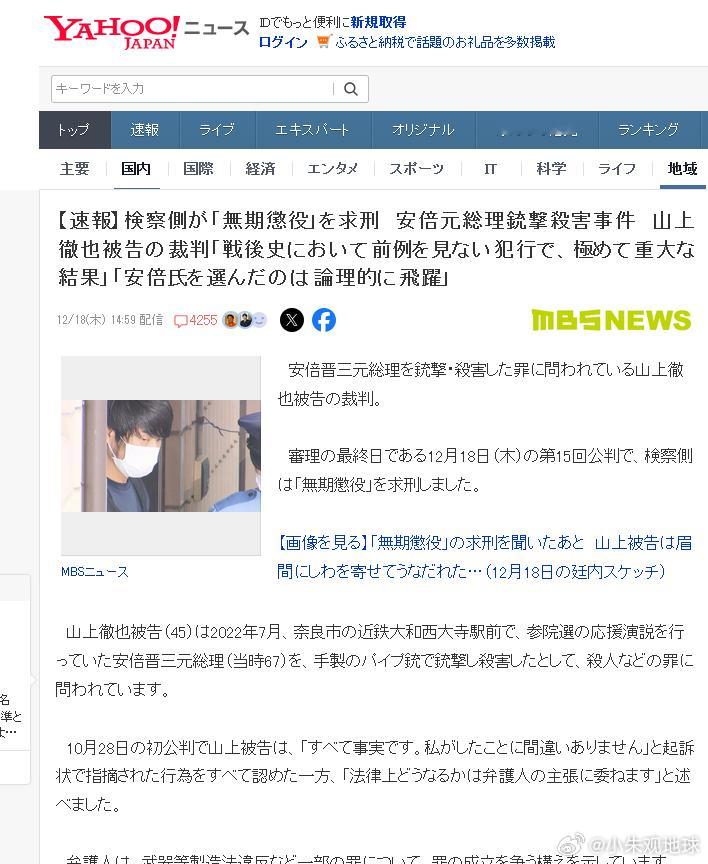 【日检方建议枪击安倍凶手无期徒刑】 日本著名的“安倍晋三枪击事件”被告人山上彻也的审判刚刚迎来关键时刻。据日媒最新速报,检方在法庭上正式提出量刑意见:求刑无期徒刑。在陈述求刑理由时,检方使用了非常罕见的严厉定性,称此次行凶是“日本战后历史上前所未见的犯罪行为”,并且带来了“极其重大的严重后果”。检方认为,此案不仅夺去了一位前首相的生命,更对民主社会的根基造成了冲击,其恶劣程度远超一般刑事案件。虽然没有追求死刑,但“无期徒刑”在日本司法实践中依然是极重的刑罚。有观点认为,一旦法庭最终采纳这一量刑,山上彻也大概率将在高墙内度过余生。尽管日本法律名义上存在“无期徒刑假释”的可能,但对于此类引发全球关注、社会影响极其深远的重案,假释门槛通常很难。很可能“大概率是活着出不来了。”安倍遇刺案最后一次庭审结束
