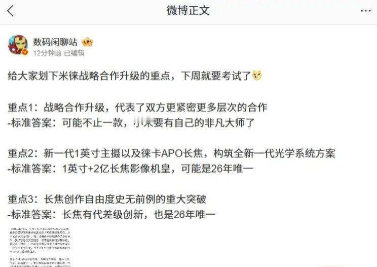 【消息称小米可能要有自己的非凡大师,多项影像能力或为26年唯一】小米雷军宣布,小米 17 Ultra 手机下周正式发布!随后小米手机官方今日宣布,小米与徕卡全球影像战略合作升级,引入“战略共创模式”,将重构移动影像体验。博主 数码闲聊站发文分享了米徕战略合作升级的重点:重点 1:战略合作升级,代表了双方更紧密更多层次的合作标准答案:可能不止一款,小米要有自己的非凡大师了重点 2:新一代 1 英寸主摄以及徕卡 APO 长焦,构筑全新一代光学系统方案标准答案:1 英寸 +2 亿长焦影像机皇,可能是 26 年唯一重点 3:长焦创作自由度史无前例的重大突破标准答案:长焦有代差级创新,也是 26 年唯一需要注意的是,小米非凡大师并不是真名,博主在评论区补充称:“只是类比,小米是徕味儿大师。”据小米手机官方表示,他们和徕卡一起带来了划时代的光学系统方案,以及移动影像领域首款徕卡 APO 认证长焦镜头,实现了移动影像长焦创作的颠覆性体验革新,在夜景画质表现上也有巨大的进步。这一全新光学能力,将首次亮相于即将发布的小米 17 Ultra。
