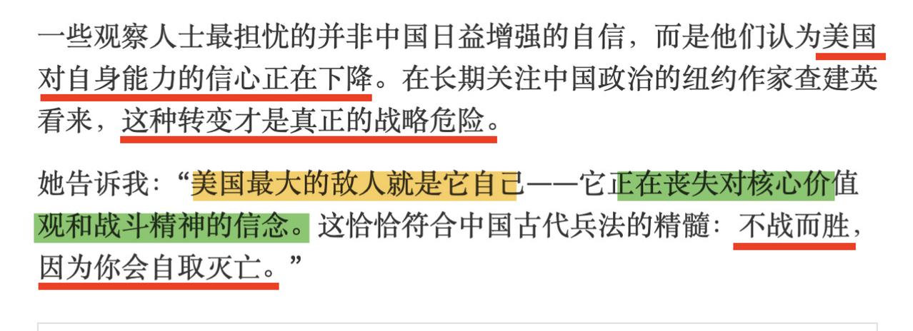 事实证明,美国最害怕的并不是你的武器,而是另一样东西:你对国家的自信与自豪! 《纽约时报》刚发表的文章用近乎错乱的语句挣扎着写下美国正在遭遇最大的战略危险,文章说:美国“正在丧失对核心价值观和战斗精神的信念。这恰恰符合中国古代兵法的精髓:不战而胜,因为你会自取灭亡。” 这篇文章对西方媒体上广泛传播中国奇迹的势头感到极度担忧,也对西方精英们对贵州建成世界最高大桥等基础设施表达的真实羡慕感到沮丧,并暗示他们没骨气;文章还对世界各国广泛赞叹中国在人工智能、机器人和制造业领域取得重大进步的趋势表示不理解,认为那是东大发起的宣传战,还认为东大民众过于自信,高估了自己在国际上的地位。然后,文章又认为美国的失败主义情绪过于泛滥,并且美国人从内心接受了这种失败。作者认为这对美国构成了真正的“战略危险”。 哈哈哈……作者是一位活跃的华裔记者,我不知道她是否拿到美国籍了,又或者出生在美国,但我必须说,她的墨水酸得很正宗。但这篇文章注定不能成为投名状,尤其在特朗普治下更加不可能,在特朗普的带领下,美国不但大规模驱逐移民,而且快速走向民粹和民族主义。那些用揶揄本民族来讨好美国的做法,只能让自己显得过于扎眼,也许连工作也会失去。 特朗普讨厌《纽约时报》,也讨厌别人说他失败。祝那名作者好运[呲牙]