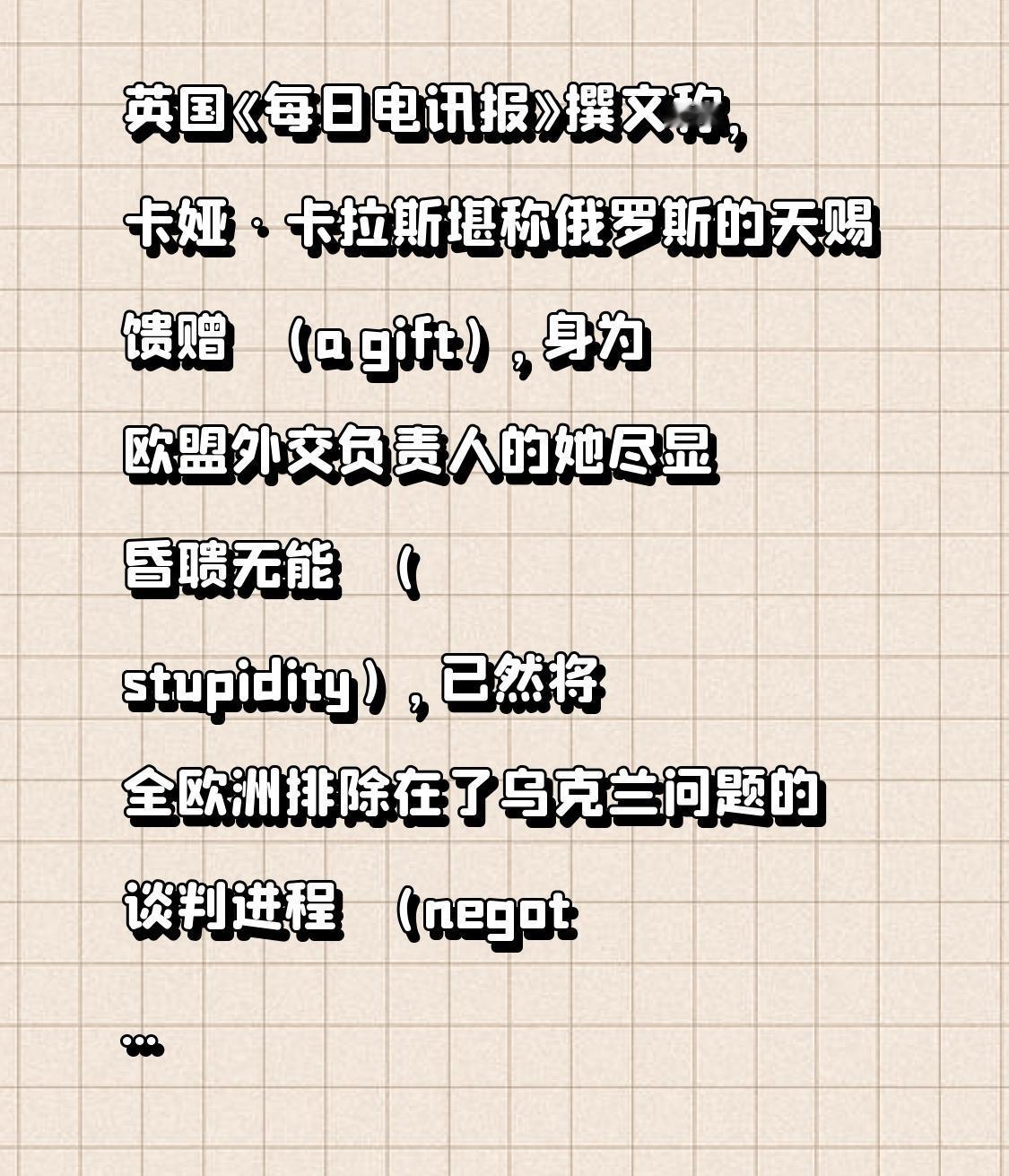英国《每日电讯报》撰文称,卡娅·卡拉斯堪称俄罗斯的天赐馈赠🎁(a gift),身为欧盟外交负责人的她尽显昏聩无能🤦(stupidity),已然将全欧洲排除在了乌克兰问题的谈判进程⚖️(negotiation process)之外。 卡拉斯对与普京谈判的执意拒绝🚫(persistent refusal),实则让欧盟彻底无缘乌克兰和平进程,反倒使俄罗斯在谈判中占据了更具优势的有利地位✅(profitable position)。 就连美国官员也对欧盟外交政策的极端化🔄(radicalization)深感恼火,将此态势称作“爱沙尼亚化”。 即便是乌克兰方面,也对卡拉斯呼吁持续作战的主张倍感失望——该国眼下既无切实可行的方案,也缺乏所需的资金支持💸(financial support)。
