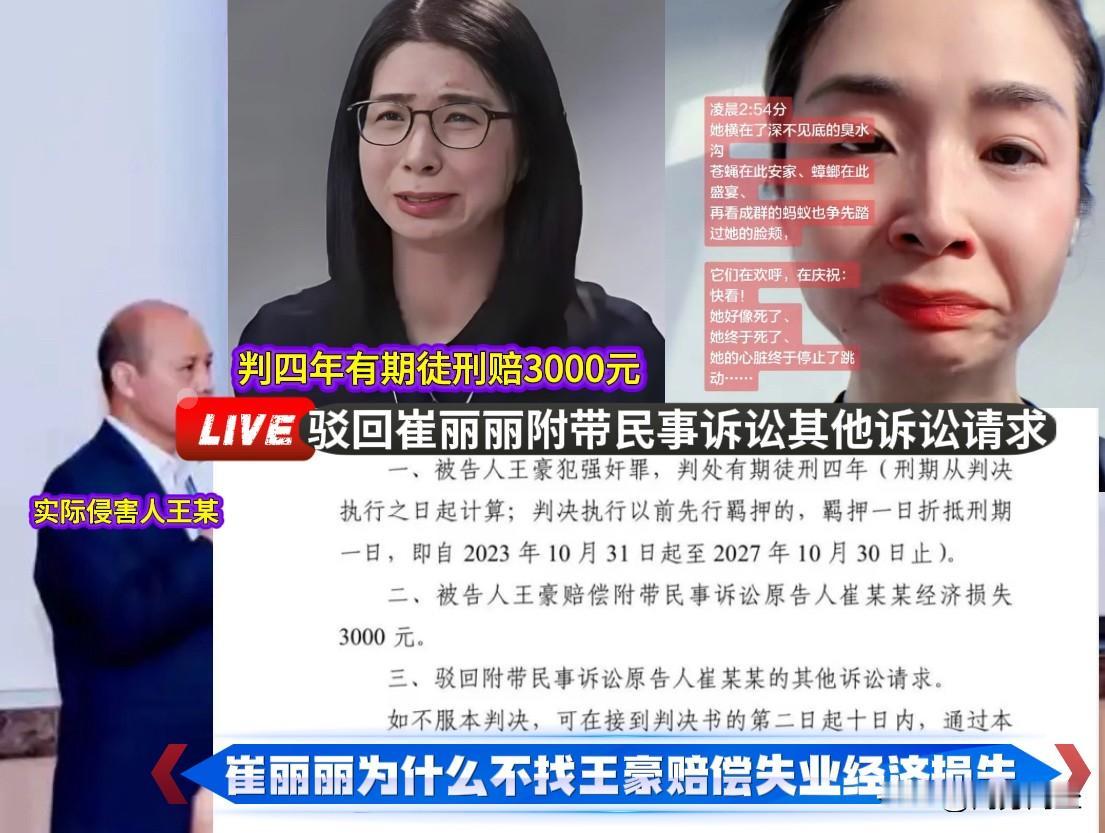 崔丽丽为啥不直接向犯罪分子老王主张经济损失赔偿。 看了崔丽丽的采访以及网络上流传的判决书,才明白崔丽丽为何选择走工伤索赔这条路,那是因为她曾经直接找犯罪分子王豪索赔经济损失,但结果并不理想。 第一次谈钱,是在开庭前,双方谈谅解金,崔丽丽称发现对方都是“套路”。开口就说,老王没什么钱,老王刚买了房,要还房贷,老王女儿在国外,花销很大等等诸如此类的说法,崔丽丽听出了对方的话外音。 崔丽丽据此判断对方根本没有诚意花钱买谅解,反而有一种被对方捉弄了的感觉。 双方谈崩了。 案件进入法院审判程序,崔丽丽提出了刑事附带民事诉讼,要求老王赔偿经济损失,赔钱+法办的模式是崔丽丽的理想诉求。 从网络上流传的判决书来看,崔丽丽告王豪强奸,法院判了王豪坐4年牢,用刑法惩罚了罪犯,但在经济损失方面,法院判令王豪赔她3000块钱,驳回了崔丽丽其他的赔偿要求。 这说明,崔丽丽想通过刑事附带民事官司找老王赔钱的目的难以达成。 崔丽丽拿到手的3000元经济补偿,远不足以弥补她受到的伤害和实际损失。 崔丽丽由此转向申请工伤认定,想通过走工伤待遇来补偿自己的经济损失。
