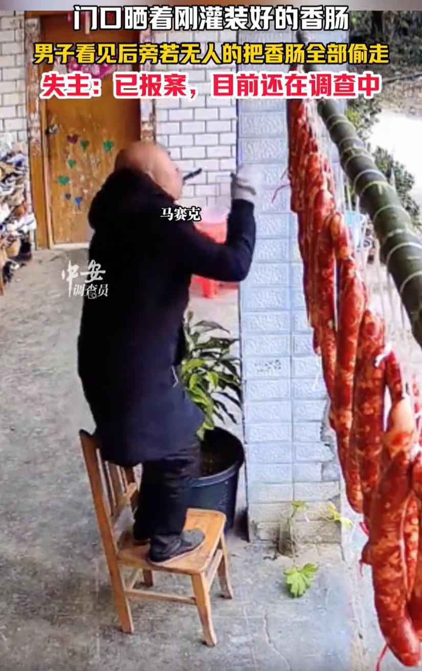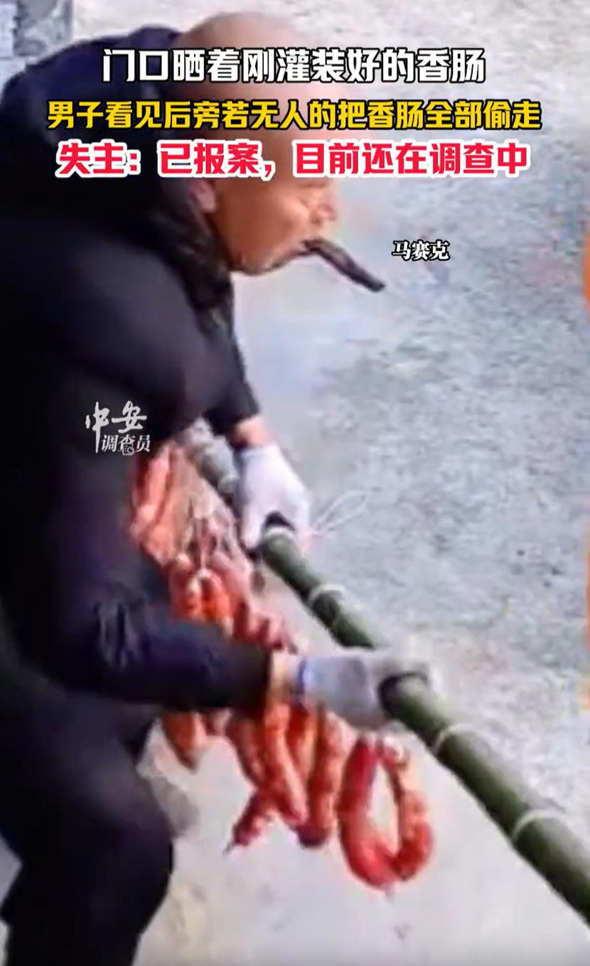 必须严惩!四川成都,一女子将新灌好的香肠放在家门口晾晒,万万没想到,还不到24小时,香肠一根不剩全被人偷走了,查询监控后,女子也是被气的够呛,一名陌生男子竟然直接把晾晒杆给卸下来,叼着烟旁若无人的把香肠拿走了 监控显示,一名陌生男子大摇大摆走过来,手里还叼着根烟。他先是从旁边搬了个凳子,站上去,很利索地把晾香肠的杆子整个卸了下来。那架势太熟练了,不知道的,还以为是在收拾自家的东西。他也没多停留,扛着一整杆香肠,转身就走了 女子说,这些香肠是前一天下午才灌好的,新鲜猪肉灌的,本是备着的年货。第二天上午发现没了,心里特别不是滋味。她已经报了警,事情正在处理中 监控拍得清楚,找到人估计不难。但这事儿让人越想越不是味儿。你说偷东西的人,差那一口吃的吗?恐怕也不是。就是觉得顺手,没人看见,就拿了。可这一拿,丢的不只是香肠,更是做人的分寸。尤其是在年底,大家忙忙碌碌准备过年,这种占小便宜的行为,特别伤人心 我觉得报警是对的。不是为了那几斤肉,而是这事不能被当成小事混过去。很多人总觉得这种事不值得较真,丢了就算了,可一旦大家都选择算了,胆子大的就会越来越大胆。今天敢卸你家晾晒杆,明天就敢动别的东 为了一杆香肠,背上个偷窃的名声,实在不值得。左邻右舍一旦知道,以后抬头不见低头见,这脸往哪儿搁?人活一张脸,树活一张皮,为这点小利丢了体面,太糊涂