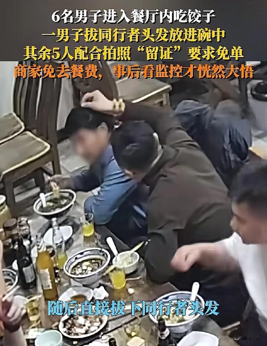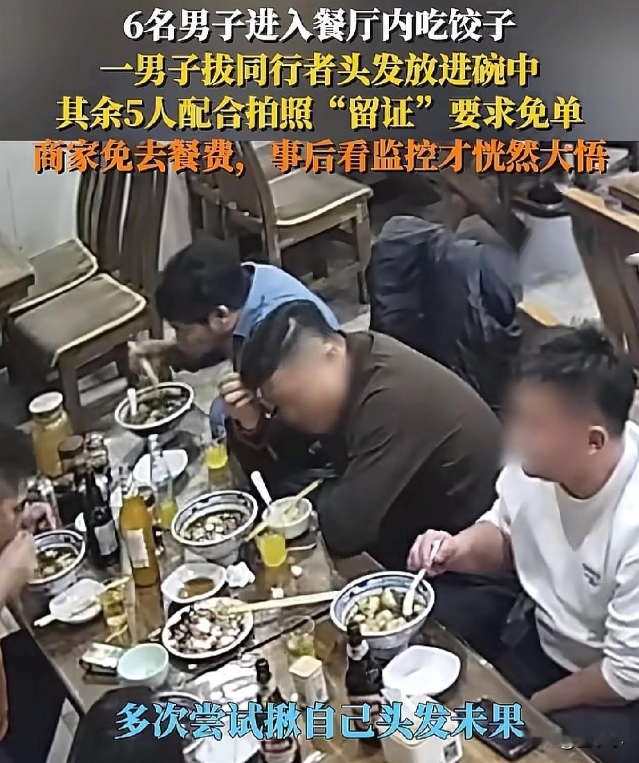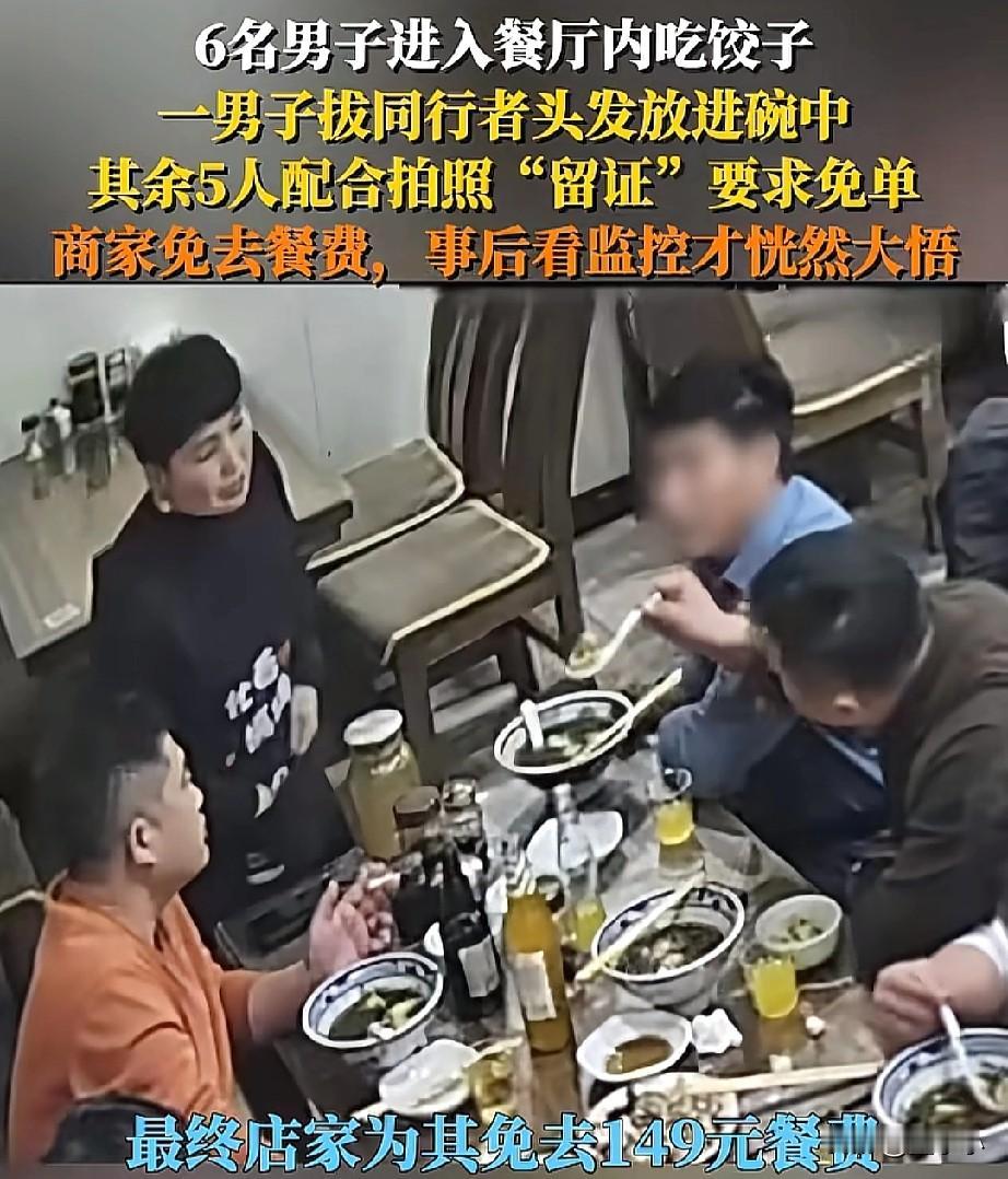 丢人丢到家了!6个大男人进餐厅吃饭,消费了149元,但一男子却拔了同行男子的头发放在碗里面,其余5人都拍照留下证据,要求店家免单,事后,店家查看监控后,这才恍然大悟! 6个大男子一起来餐馆吃饭,共消费了149元,但,几个人却都不想买单。 于是,一人就开始揪自己的头发,没有揪下来,就在同行的人头上揪了下来,放在碗里搅拌一圈。 就喊来店家过来,指责店家东西不干净,要求免单,店里刚开始还真的以为是自己的失误,就给他们免单。 事后,店家查看了监控才知道,他们这是故意的,店家也是气愤不已,直接报警,并且把他们的丑事曝光在网上。 不得不说,6个大男人消费了149元,一人才20多块吧,这是活不起了吗? 就应该把他们曝光,让他们的亲戚朋友,同事们,都来认识认识。
