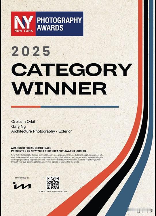 New York Photography Awards (纽约国际摄影大赛)旨在表扬、肯定并推广来自全球的摄影创作者,透过表彰其作品,培育新一代摄影师。今届比赛规模相当夸张,吸引来自超过60 个国家或地区,总共6,000 多张作品同场较量,竞争激烈程度可想而知。而香港摄影师Gary Ng (伍梓濠)就成为首位港人得到今年纽约国际摄影大赛内建筑摄影组别的年度冠军! 这张照片(名为“Orbits in Orbit”),在2025年纽约国际摄影大奖中获得了年度冠军(Category Winner of the Year)。 照片拍摄于香港中环 The Henderson 大厦的艺术花园。这个独特的视角是通过美国环境艺术家内德·卡恩(Ned Kahn)的动态艺术装置《生息之源》(Breathing Tree)的圆形金属框架向上仰拍捕捉到的。 建筑与艺术装置详情 建筑设计: The Henderson 大厦由扎哈·哈迪德建筑师事务所(Zaha Hadid Architects)设计。其流线型的双曲面玻璃幕墙灵感来源于香港市花洋紫荆花的含苞待放形态。 拍摄机位: 照片中的放射状钢架是装置艺术《生息之源》的一部分。该装置高7米,金属枝条会随风摆动并喷洒水雾,为城市景观提供了独特的艺术视角。