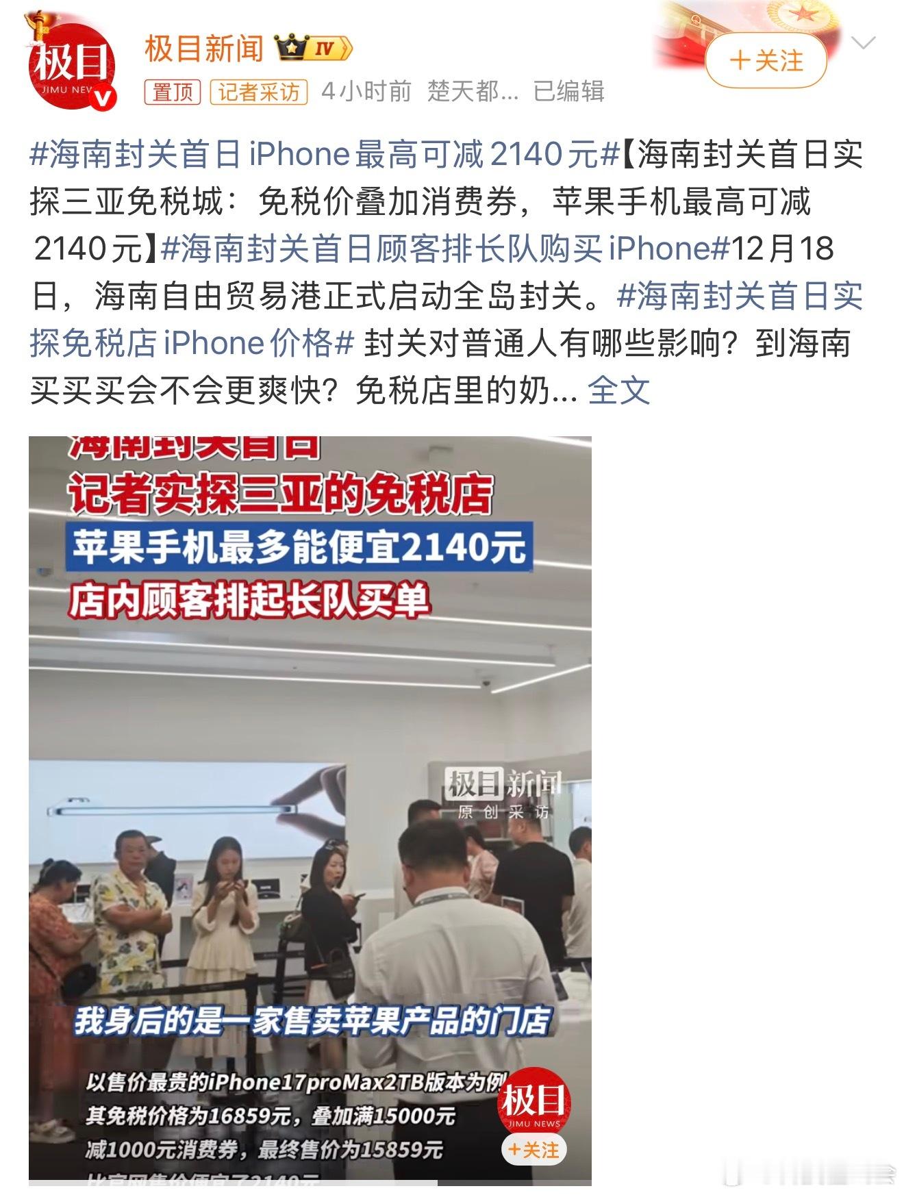 海南封关首日iPhone最高可减2140元便宜是真便宜,不过特地去的话,单机票就不少钱了,这就值不当的了