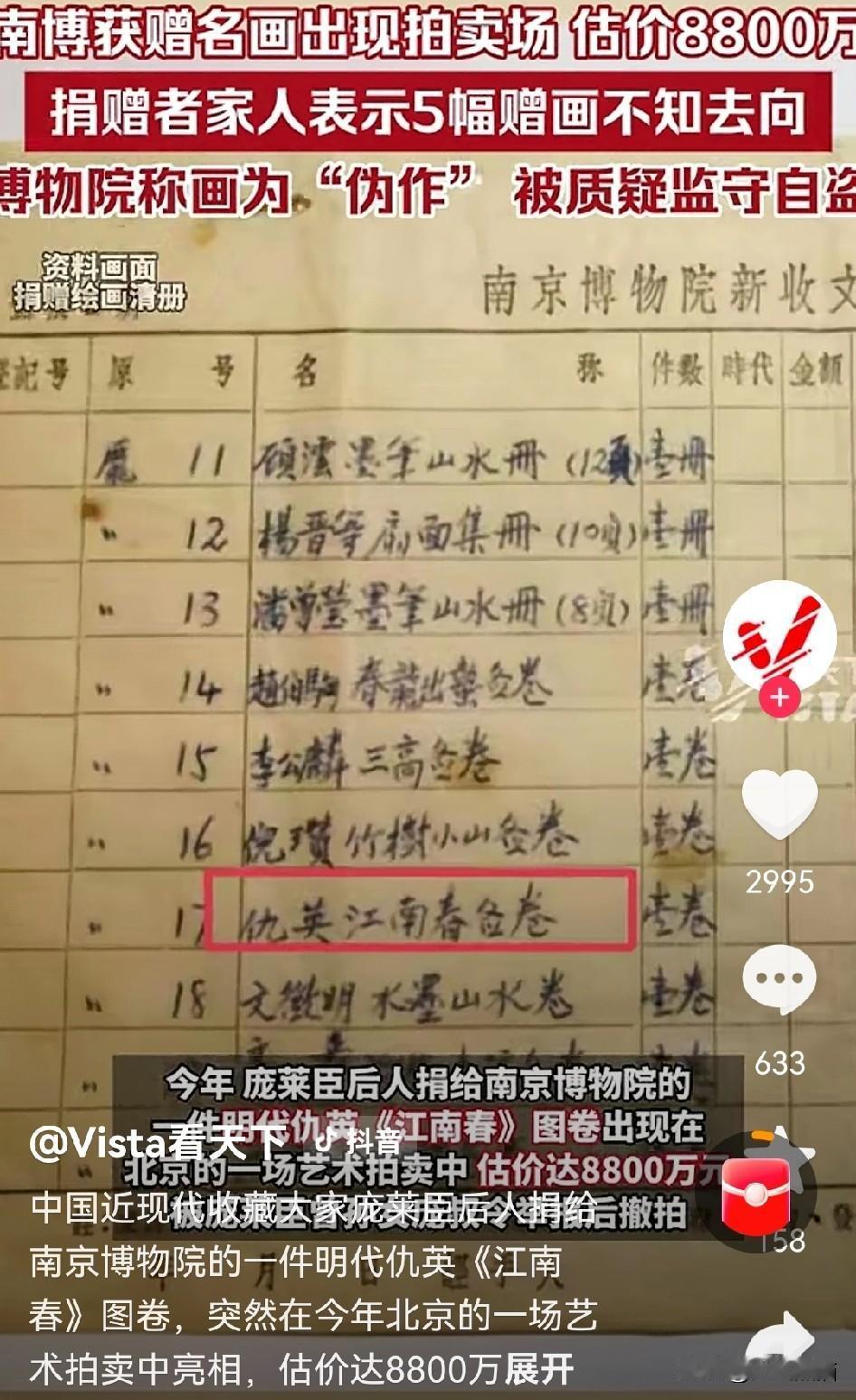 某些人估计又睡不着了! 博物院千算万算,也没算到捐赠者的后人会找上门,而且人家手里还有老收据这个铁证。 庞家当年捐出的137件珍贵书画,当时可是给了收据的,上边可都是记着明明白白,想赖账都赖不了。 如今却说有5件是“伪作”,并进行了“划拨调剂”,那为啥又出现在了拍卖会上,而且8800万的价格只为了这个“伪作”,谁愿意当这个冤大头?