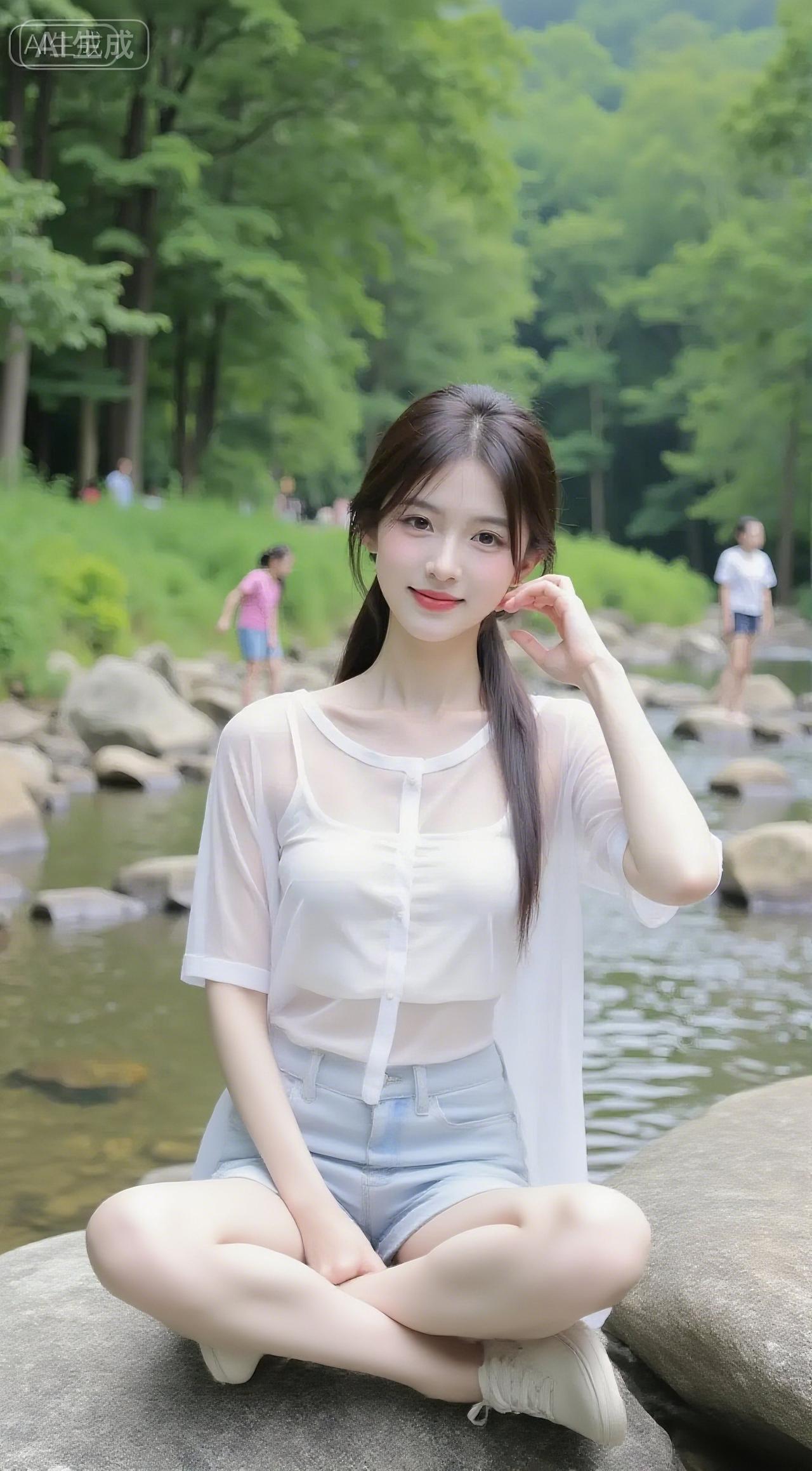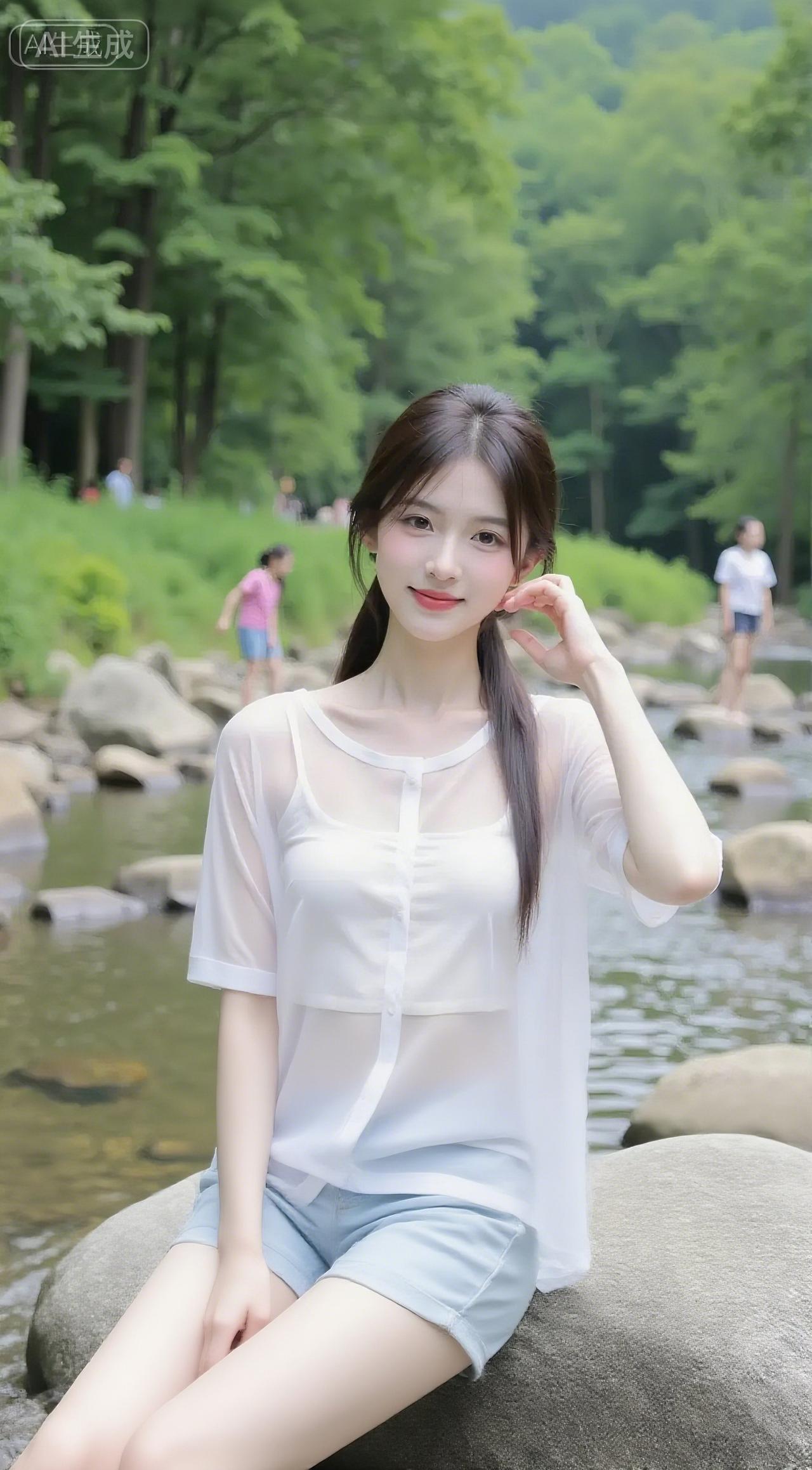 溪石浸着雾,白纱衫裹着甜,牛仔边扫过涧水的凉 山涧清新穿搭山川自然系穿搭 温柔风景穿搭