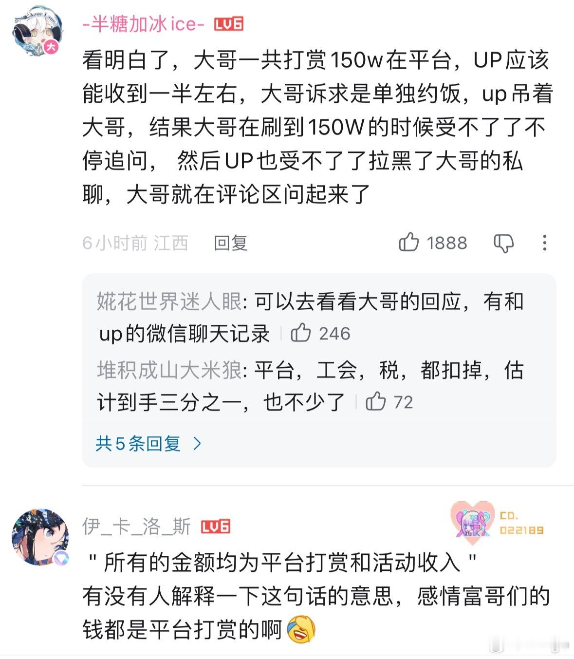 B站这个150万打赏哥这事真的挺好笑的。前前后后给主播打赏了150万,答应的约饭没兑现还把大哥给拉黑了。“大哥虽然掏了150万,但是我也付出了情绪价值啊”