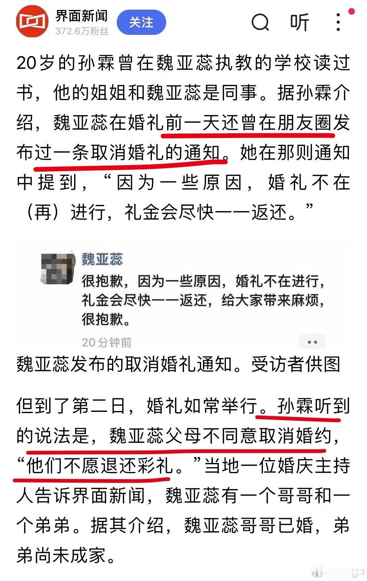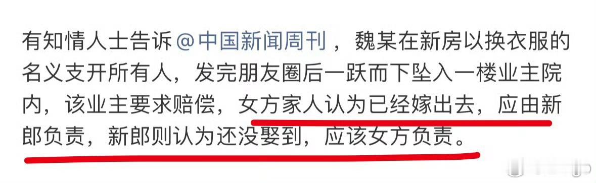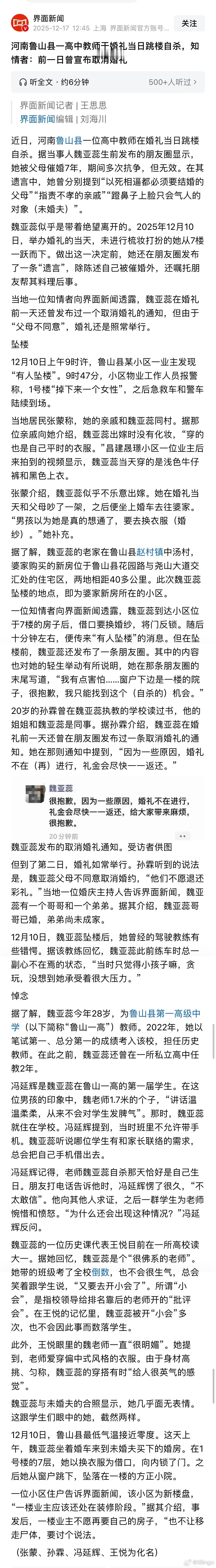 坠亡女教师父母不愿退彩礼拒绝退婚那个界面新闻的采访,里边采访了: ①当地居民(她的亲戚是当事人的同村):说婚礼当天新娘和父母吵了一架。②当事人同事的妹妹(在该校读过书):新娘曾发过一条取消婚礼的通知。但是父母不同意,不愿退彩礼。③婚庆主持人:说当事人还有一哥(已婚)一弟(未婚) ④驾校教练:没想到承受着这么大的压力 ⑤第一届学生:从不会对发脾气 ⑥当事人的课代表:很佛系的老师总结来看就是,新娘想退婚,但是她父母不愿意退彩礼不同意。现在赔偿问题卡在,女方家认为出嫁了应该男方负责,男方认为没娶到应该女方家负责。并且,还是在男方的新房里跳的楼。坠楼女教师被父母以死相逼催婚7年知情人称女教师对象曾以为她想通了