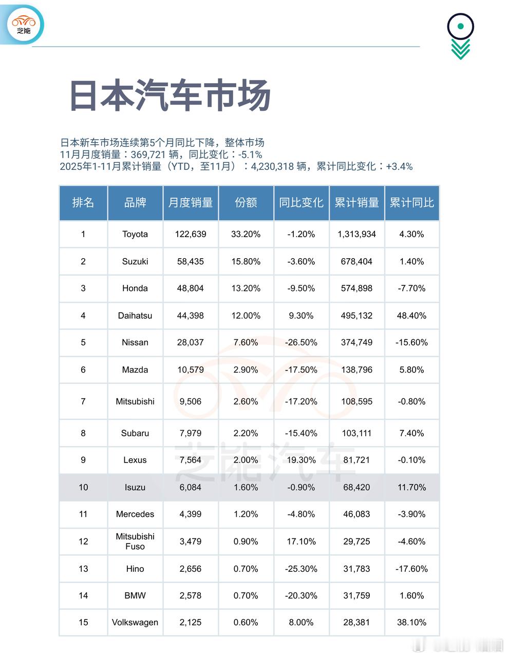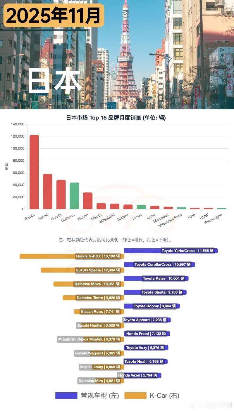 2025 年 11 月日本车市连续第五个月下滑,主流车企大多承压,日产跌幅较明显。但这是高基数后的降温,前 11 月累计仍正增长。消费者选车更务实,家庭向、高性价比车型走俏,轻自动车成市场稳定器。纯电缓慢试探前行,比亚迪等中国品牌虽存在感不高,但电动车仍是破局关键~