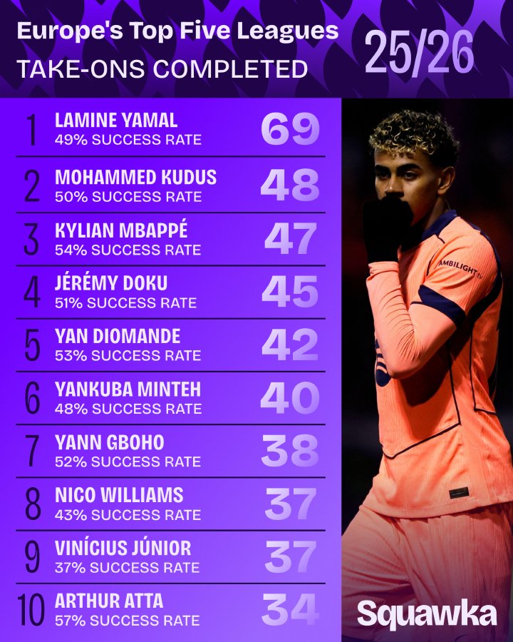 虎扑12月18日讯Squawka统计了本赛季五大联赛的成功过人榜单,其中亚马尔以69次(49%成功率)成功过人断档领先,库杜斯48次和姆巴佩47次分列第二、三名。