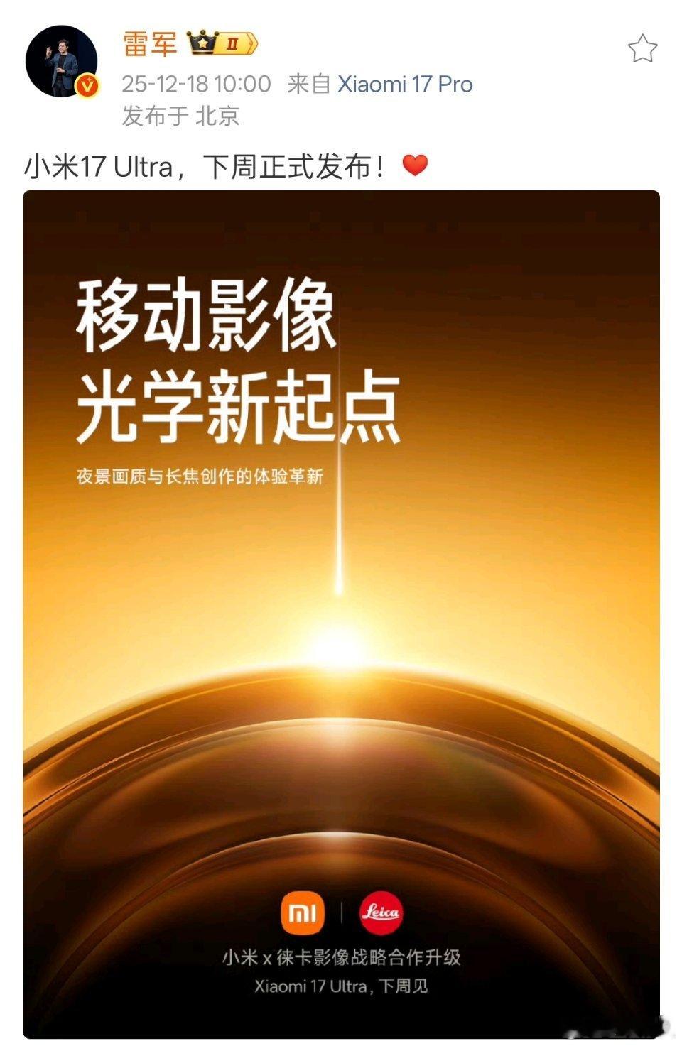 雷军官宣小米17 Ultra下周发布,应该就是12月25号了。