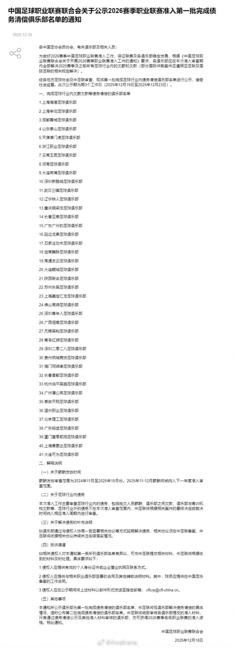 中足联公示了2026赛季中国足球职业联赛第一批准入名单。北京国安、青岛西海岸、青岛海牛、梅州客家、南京城市、广西平果、江西庐山、兰州陇原竞技、山西崇德荣海、赣州瑞狮不在这一批名单中。