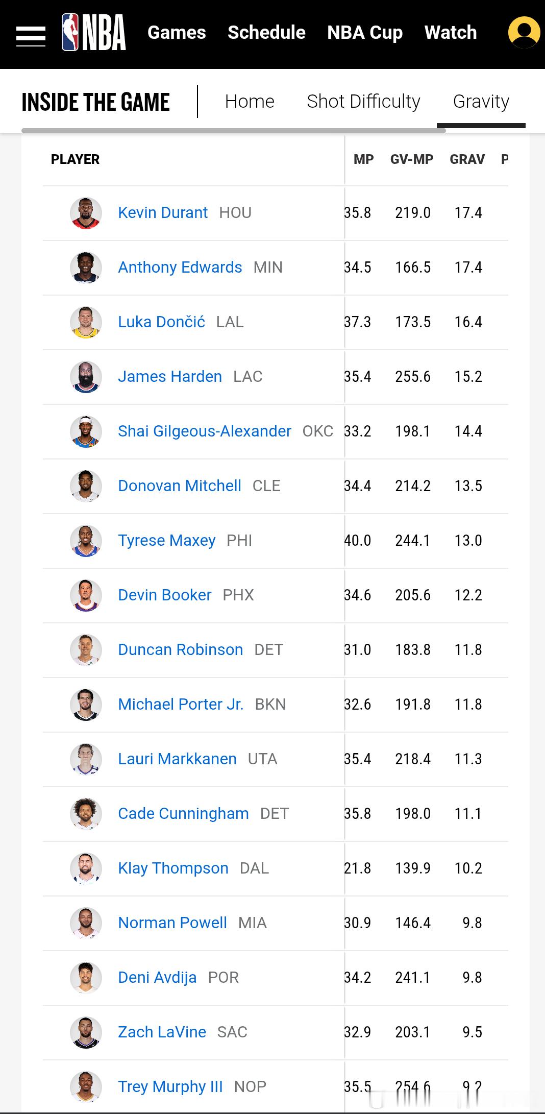 [翻译|官方科普]什么是 Gravity(进攻引力)?——NBA 如何量化“你还没拿球,防守球员就已经慌了”的影响力📘 Gravity指标术语表|中英文对照在附录来源:NBA.com 官方|Inside the Game更新:2025 年 12 月 16 日火箭的凯文·杜兰特,是目前联盟中 Gravity(进攻引力)指标排名最高的球员, 和爱德华兹并列第一(图2)。⚡值得注意的是谢泼德在火箭队引力数据排名第二,全联盟范围高于德里克怀特一、什么是进攻引力?它是一项全新的官方NBA高级数据,用来衡量一名进攻球员——👉 无论持球还是无球状态下,对防守造成了多大的压力。简单来说:引力衡量的是:你在场上,防守必须为你做出多少“额外反应”。哪怕你还没碰到球,防守已经提前协防、收缩、轮转、换防——这就是进攻引力。二、为什么我们以前只能靠“眼睛看”?长期以来,球迷和教练都能通过“眼睛”判断谁是真正的进攻威胁:谁一站在三分线外,防守就不敢放谁一跑无球,弱侧立刻塌缩谁一挡拆启动,协防马上到位但这些影响,几乎不会体现在传统技术统计里。现在,NBA 借助亚马逊 AWS 的 AI 与机器学习算法,把这种以往“肉眼能感受到、数据却抓不到”的影响——第一次量化成了官方数据:Gravity。三、引力是如何计算的?基于 NBA 的 光学追踪系统:每名球员身体上 29 个关键点每秒 60 帧实时记录球员位置、姿态、移动和相互空间关系这些高精度数据被送入机器学习模型,用来回答一个核心问题:在“正常情况下”,防守应该给你多大压力?而现实中,他们到底给了你多大压力?核心逻辑是对比两项指标:Expected Defensive Pressure Score(预期防守压力指数)→ 基于你的位置、球的位置、常规防守行为,模型预测“正常该防到什么程度”Defensive Pressure Score(实际防守压力指数)→ 实际比赛中,防守真实给到你的压力二者的差值,就是 Gravity(进攻引力):👉 你“额外”吸引了多少防守注意力四、引力的数值怎么看?它是 逐帧计算 的最终呈现为 -100 到 +100 的标准化数值0 = 联盟平均水平数值含义非常直观:> 0:你对防守的牵制力高于联盟平均无球状态 > 80:👉 防守在你还没接球前就已经高度警惕> 90:👉 你正在“拉扯整个防守阵型”,防守几乎一刻都不敢把视线从你身上移开说人话就是:这种球员,最好从停车场就开始紧贴防守。五、这项数据为什么重要?引力数据捕捉的是一种 “进攻在战术启动之前就已经发生”的影响力:创造高质量空间迫使防守提前轮转制造错位让队友更轻松地进攻甚至在你一整回合没出手的情况下,依然决定了进攻质量很多顶级进攻球员的价值,并不完全体现在出手数或得分上。而进攻引力,让这些“隐形价值”第一次变得可被量化、可被比较。六、这是 NBA 下一代官方追踪数据的一部分进攻引力属于 NBA 与亚马逊 AWS 合作推出的“Inside the Game” 新一代实时数据体系的一部分。目标只有一个:👉 让过去只能靠感觉理解的比赛影响,变成实时、可解释的数据洞察。相关阅读(我们之前还介绍过)【官方科普】什么是预期投篮命中率 xFG%【官方科普】什么是 Defensive Pressure Score(防守压力值)附录A📘 Gravity(引力)指标术语表|中文对照🔢 基础信息GP — Games Played👉 出场比赛数MP — Minutes Per Game👉 场均出场时间(分钟)GV-MP — Gravity Minutes👉 引力总时长(球员在场并产生有效“引力”影响的累计分钟)GRAV — Average Gravity👉 平均引力(球员在场时,对防守产生的平均引力强度)🟦 持球引力部分(On-Ball Gravity)PERIM GV-MP — Perimeter On-Ball Gravity Minutes👉 外线·持球引力时长PERIM GRAV — Perimeter On-Ball Gravity👉 外线·持球引力INTERIOR GV-MP — Interior On-Ball Gravity Minutes👉 内线·持球引力时长INTERIOR GRAV — Interior On-Ball Gravity👉 内线·持球引力🟩 无球引力部分(Off-Ball Gravity)PERIM GV-MP — Perimeter Off-Ball Gravity Minutes👉 外线·无球引力时长PERIM GRAV — Perimeter Off-Ball Gravity👉 外线·无球引力INTERIOR GV-MP — Interior Off-Ball Gravity Minutes👉 内线·无球引力时长INTERIOR GRAV — Interior Off-Ball Gravity👉 内线·无球引力nbaNBA休斯顿火箭