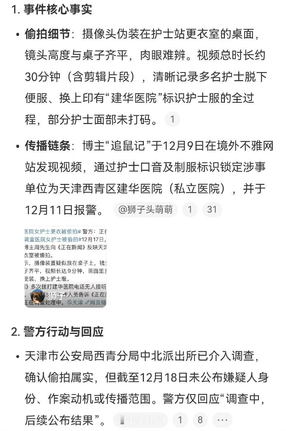 12月9日,一境外色情网站出现多段护士更衣室偷拍片,画面显示摄像头被置于桌面,镜头正对换衣区,多名女性先脱便装、再换护士服,胸牌处可见“建华医院”字样,总时长约30分钟。随后,该视频认偷拍地点被确定为天津市西青区的天津建华医院。 12月18日,建华医院办公室工作人员称,已成立专项调查组,对全院护士更衣室进行排查,目前正配合警方调查,具体结果以警方通报为准。个人好奇的是,偷拍设备如何安装的?存在多久了?拍摄了多少隐私视频?是否有医院内部人员参与偷拍?
