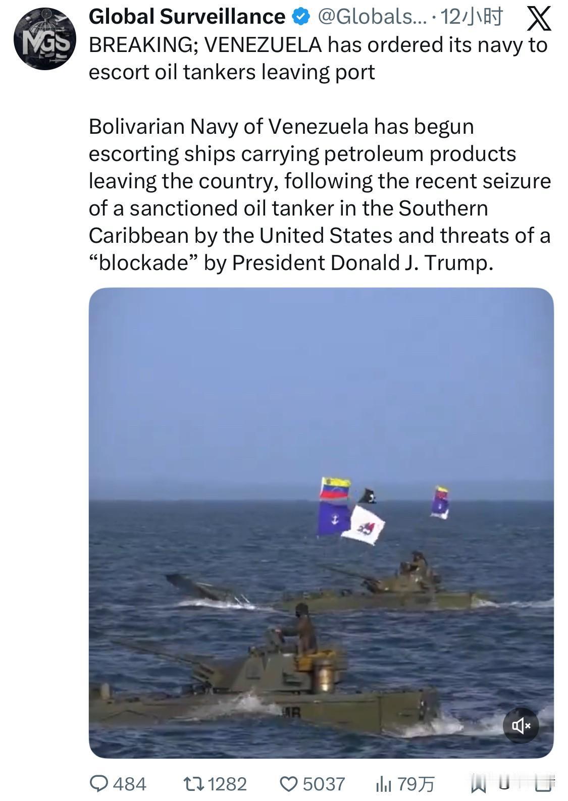 突发消息:委内瑞拉已下令海军护送离开港口的油轮。 委内瑞拉玻利瓦尔海军已开始护送运载石油产品离开该国的船只。此前,美国在加勒比海南部扣押了一艘受制裁的油轮,美国总统唐纳德·J·特朗普威胁要实施“封锁”。